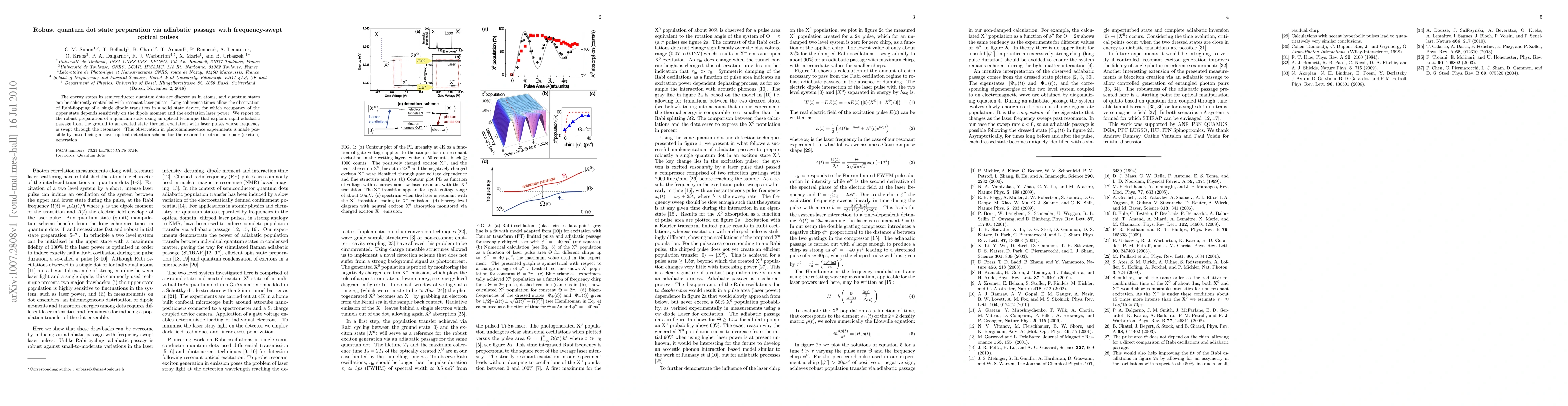 This paper explores a robust method for preparing quantum dot states using adiabatic passage with frequency-swept optical pulses, achieving precise control over state occupancy through a novel optical detection scheme for exciton generation. The technique leverages rapid adiabatic passage to enhance coherence and stability in solid-state quantum devices.