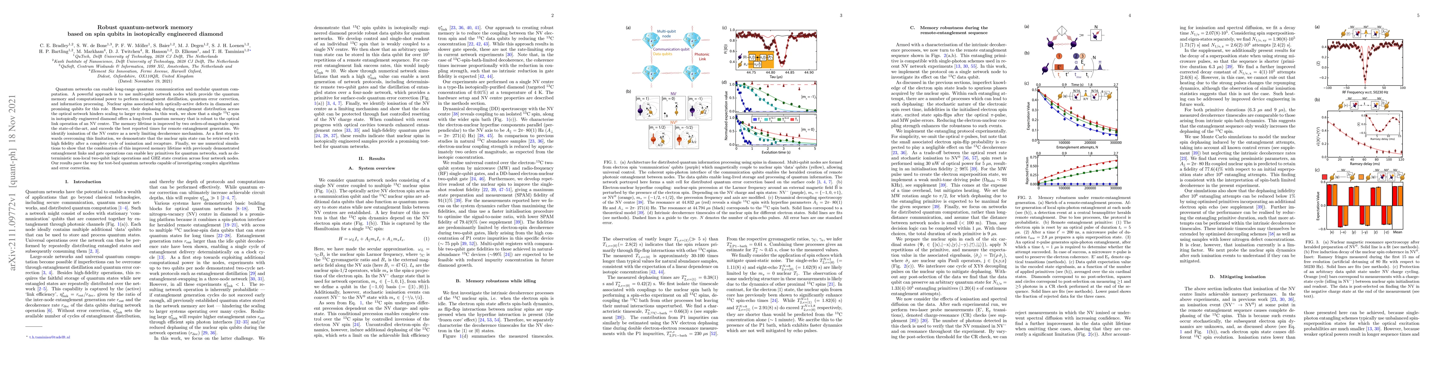 This paper demonstrates a robust quantum-network memory using a 13C spin in isotopically engineered diamond, achieving a two-order-of-magnitude improvement in memory lifetime over current state-of-the-art. The study identifies ionization of NV centres as a new decoherence source and shows high-fidelity retrieval of nuclear spin states post-ionization, paving the way for advanced quantum network operations.