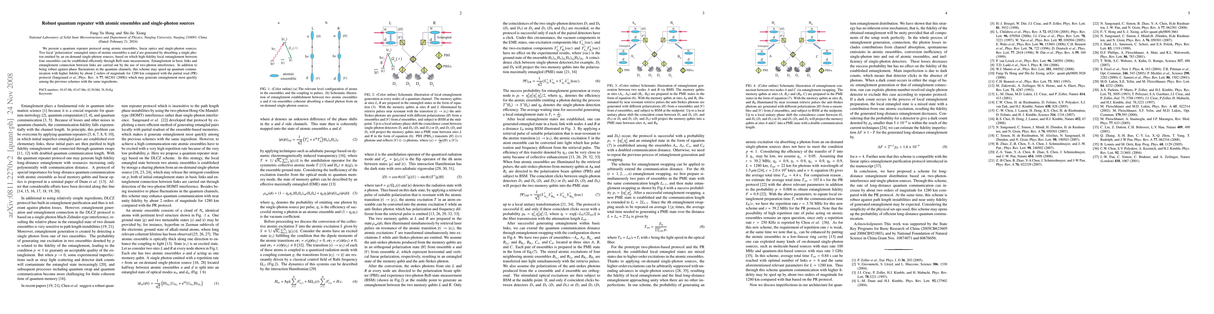 This paper proposes a quantum repeater protocol utilizing atomic ensembles and single-photon sources to establish high-fidelity entanglement over long distances, achieving robustness against phase fluctuations and a significant improvement in communication speed and fidelity over existing protocols.