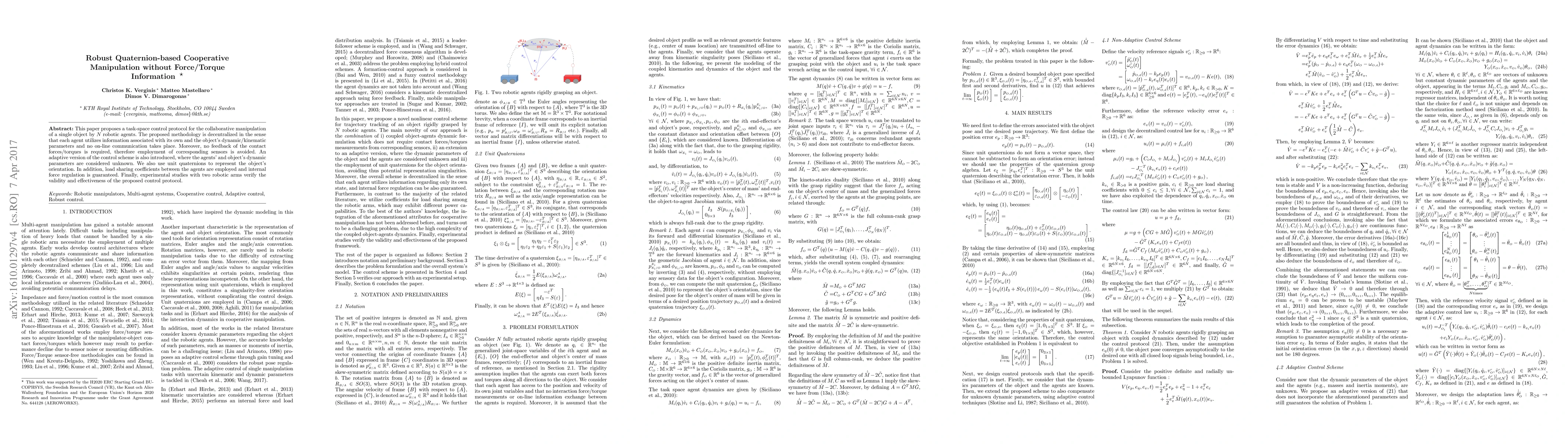 This paper proposes a task-space control protocol for the collaborative manipulation of a single object by N robotic agents. The proposed methodology is decentralized in the sense that each agent utilizes information associated with its own and the object's dynamic/kinematic parameters and no on-line communication takes place. Moreover, no feedback of the contact forces/torques is required, therefore employment of corresponding sensors is avoided. An adaptive version of the control scheme is also introduced, where the agents' and object's dynamic parameters are considered unknown. We also use unit quaternions to represent the object's orientation. In addition, load sharing coefficients between the agents are employed and internal force regulation is guaranteed. Finally, experimental studies with two robotic arms verify the validity and effectiveness of the proposed control protocol.