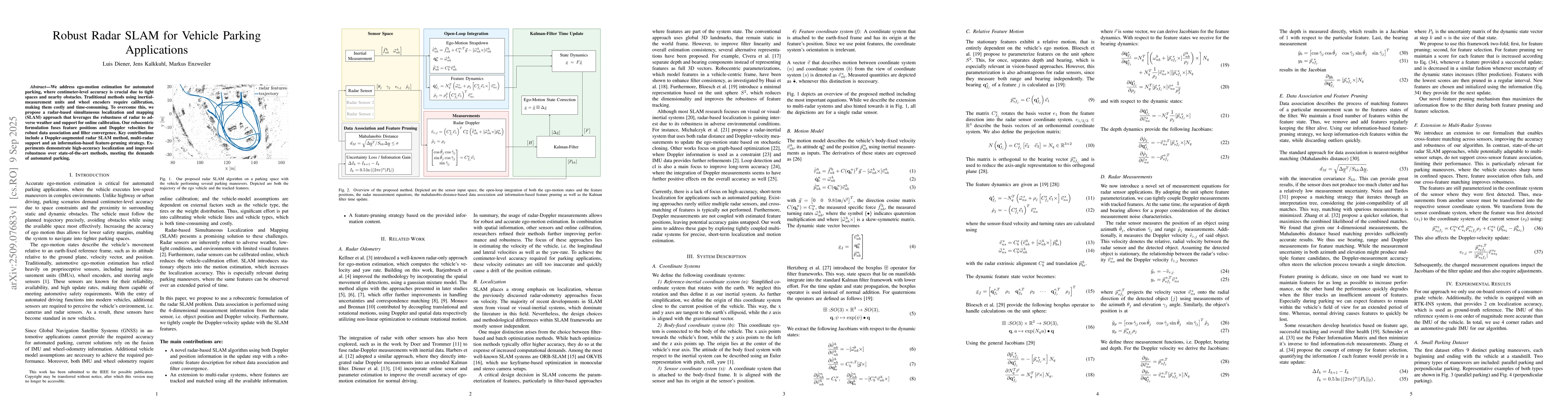 We address ego-motion estimation for automated parking, where centimeter-level accuracy is crucial due to tight spaces and nearby obstacles. Traditional methods using inertial-measurement units and wheel encoders require calibration, making them costly and time-consuming. To overcome this, we propose a radar-based simultaneous localization and mapping (SLAM) approach that leverages the robustness of radar to adverse weather and support for online calibration. Our robocentric formulation fuses feature positions and Doppler velocities for robust data association and filter convergence. Key contributions include a Doppler-augmented radar SLAM method, multi-radar support and an information-based feature-pruning strategy. Experiments demonstrate high-accuracy localization and improved robustness over state-of-the-art methods, meeting the demands of automated parking.