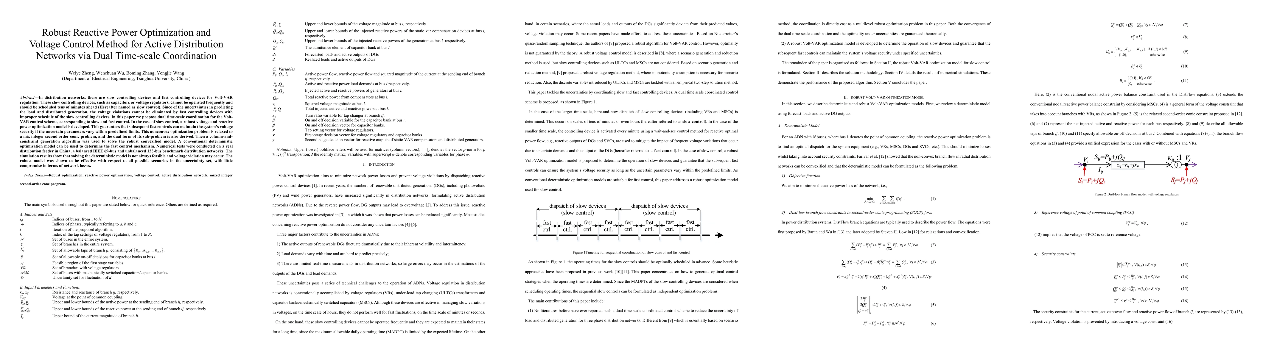 This paper proposes a dual time-scale coordination method for Volt-VAR control in active distribution networks, addressing uncertainties in load and distributed generation. It develops a robust optimization model for slow control to ensure voltage security, transforming the nonconvex problem into a convex form, and uses a column-and-constraint generation algorithm for solution. Numerical tests show that the robust model effectively handles uncertainties without significant increases in network losses.