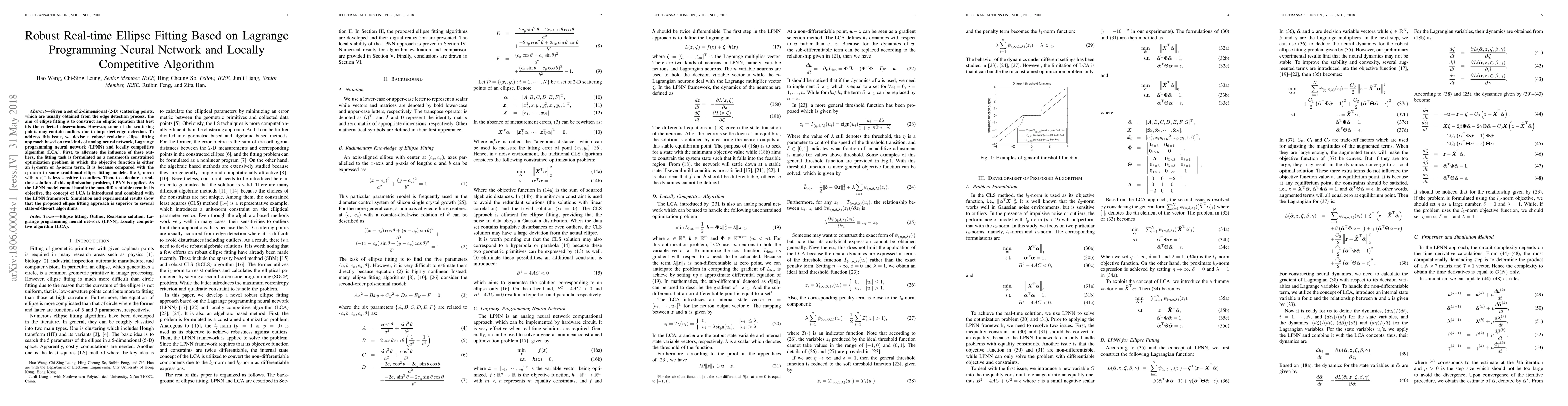 This paper proposes a robust real-time ellipse fitting method using a combination of Lagrange programming neural network (LPNN) and locally competitive algorithm (LCA) to handle outliers in 2D scattering points. The method formulates the fitting as a nonsmooth optimization problem with l1-norm or l0-norm to minimize outlier influence, and employs LPNN and LCA to achieve real-time solutions, outperforming existing algorithms.