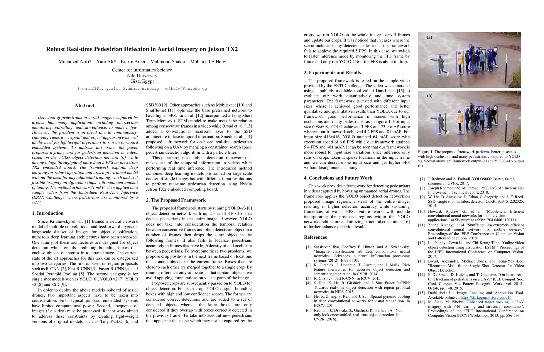 This paper proposes a YOLO-based framework for real-time pedestrian detection in aerial drone imagery on the Jetson TX2 board, achieving over 5 FPS and ~81 mAP without requiring additional training, leveraging a pre-trained model for flexibility and robustness.