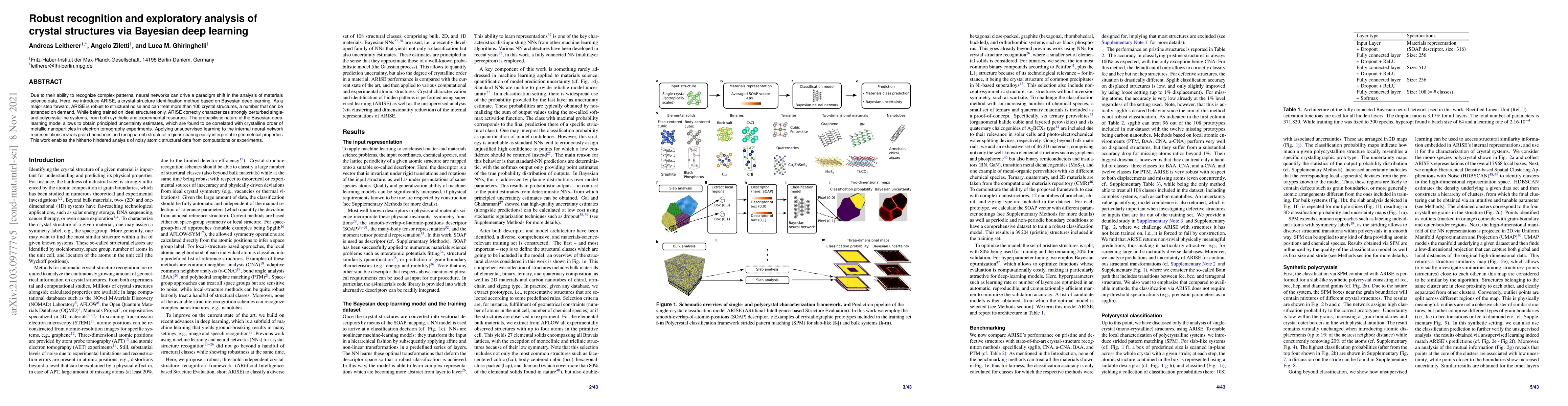 Due to their ability to recognize complex patterns, neural networks can drive a paradigm shift in the analysis of materials science data. Here, we introduce ARISE, a crystal-structure identification method based on Bayesian deep learning. As a major step forward, ARISE is robust to structural noise and can treat more than 100 crystal structures, a number that can be extended on demand. While being trained on ideal structures only, ARISE correctly characterizes strongly perturbed single- and polycrystalline systems, from both synthetic and experimental resources. The probabilistic nature of the Bayesian-deep-learning model allows to obtain principled uncertainty estimates, which are found to be correlated with crystalline order of metallic nanoparticles in electron tomography experiments. Applying unsupervised learning to the internal neural-network representations reveals grain boundaries and (unapparent) structural regions sharing easily interpretable geometrical properties. This work enables the hitherto hindered analysis of noisy atomic structural data from computations or experiments.