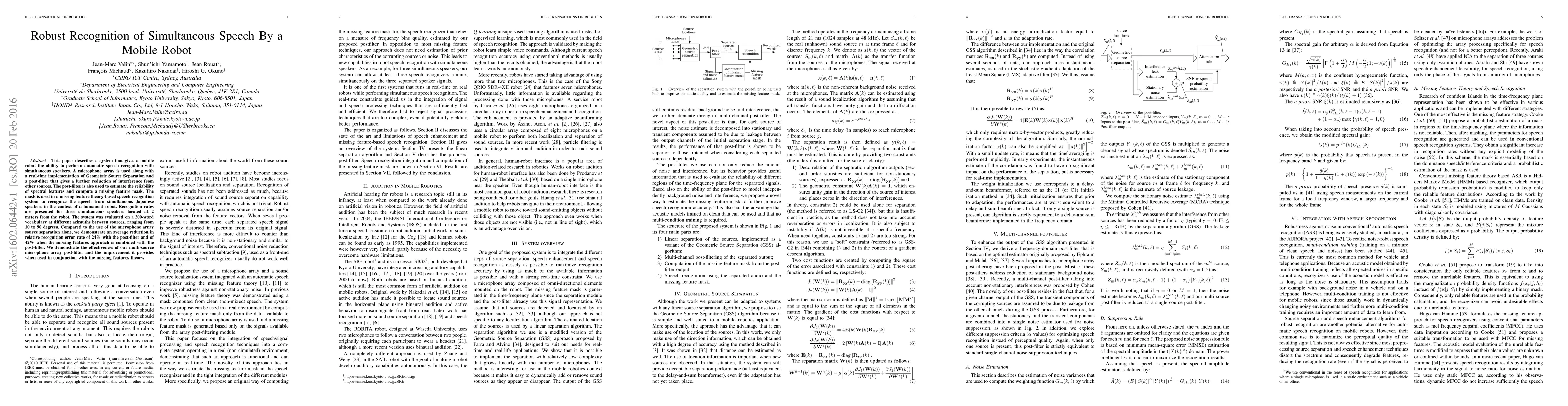 This paper presents a mobile robot system for robust speech recognition from multiple simultaneous speakers using a microphone array, real-time geometric source separation, and a post-filter that enhances recognition by reducing interference and estimating feature reliability. The system achieves a 24% reduction in recognition error with the post-filter and a 42% reduction when combined with missing feature theory.