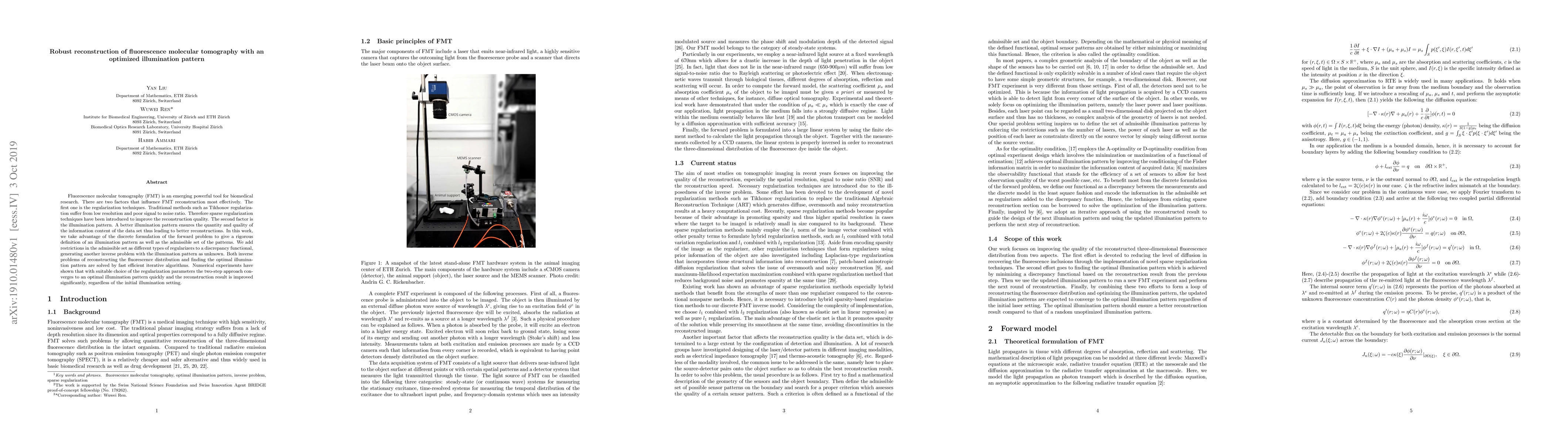 Fluorescence molecular tomography (FMT) is an emerging powerful tool for biomedical research. There are two factors that influence FMT reconstruction most effectively. The first one is the regularization techniques. Traditional methods such as Tikhonov regularization suffer from low resolution and poor signal to noise ratio. Therefore sparse regularization techniques have been introduced to improve the reconstruction quality. The second factor is the illumination pattern. A better illumination pattern ensures the quantity and quality of the information content of the data set thus leading to better reconstructions. In this work, we take advantage of the discrete formulation of the forward problem to give a rigorous definition of an illumination pattern as well as the admissible set of patterns. We add restrictions in the admissible set as different types of regularizers to a discrepancy functional, generating another inverse problem with the illumination pattern as unknown. Both inverse problems of reconstructing the fluorescence distribution and finding the optimal illumination pattern are solved by fast efficient iterative algorithms. Numerical experiments have shown that with a suitable choice of the regularization parameters the two-step approach converges to an optimal illumination pattern quickly and the reconstruction result is improved significantly, regardless of the initial illumination setting.