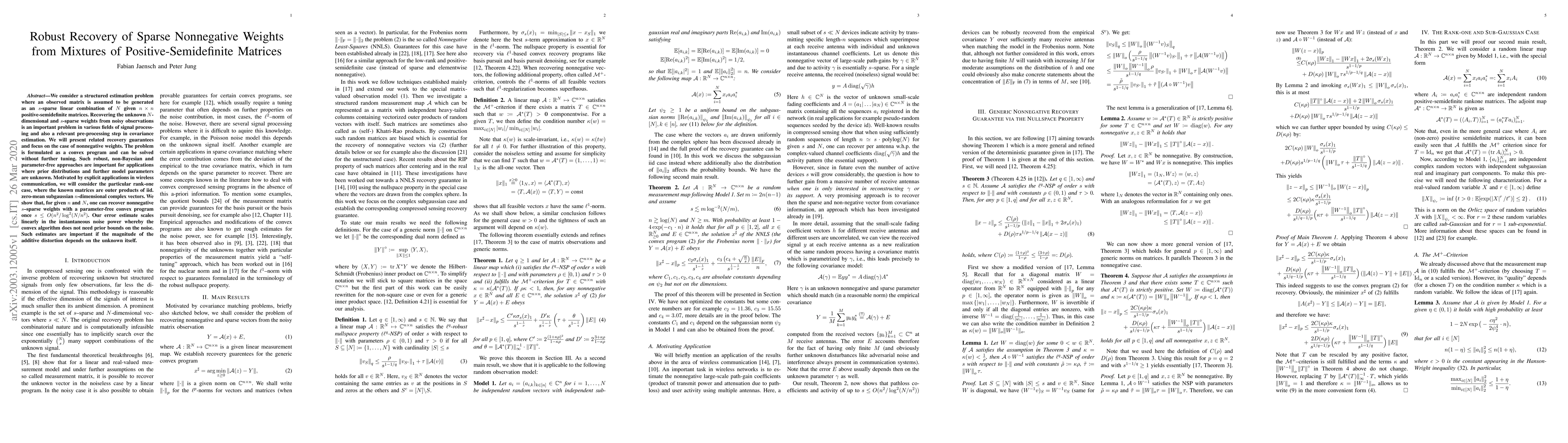 Researchers developed a method to recover sparse weights from noisy data using mixtures of positive-semidefinite matrices, with an error estimate that scales linearly in the noise power.