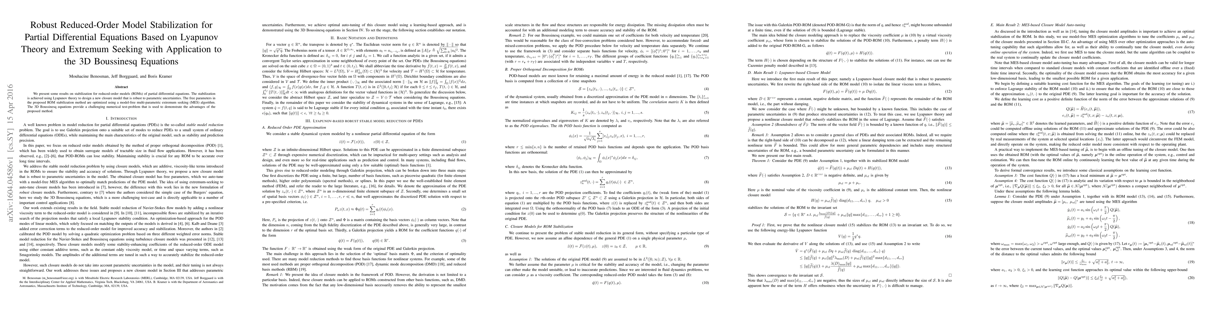 This paper develops a robust stabilization method for reduced-order models of partial differential equations using Lyapunov theory and extremum seeking. The method optimizes free parameters via a multi-parametric extremum seeking algorithm and is demonstrated on the 3D Boussinesq equations.