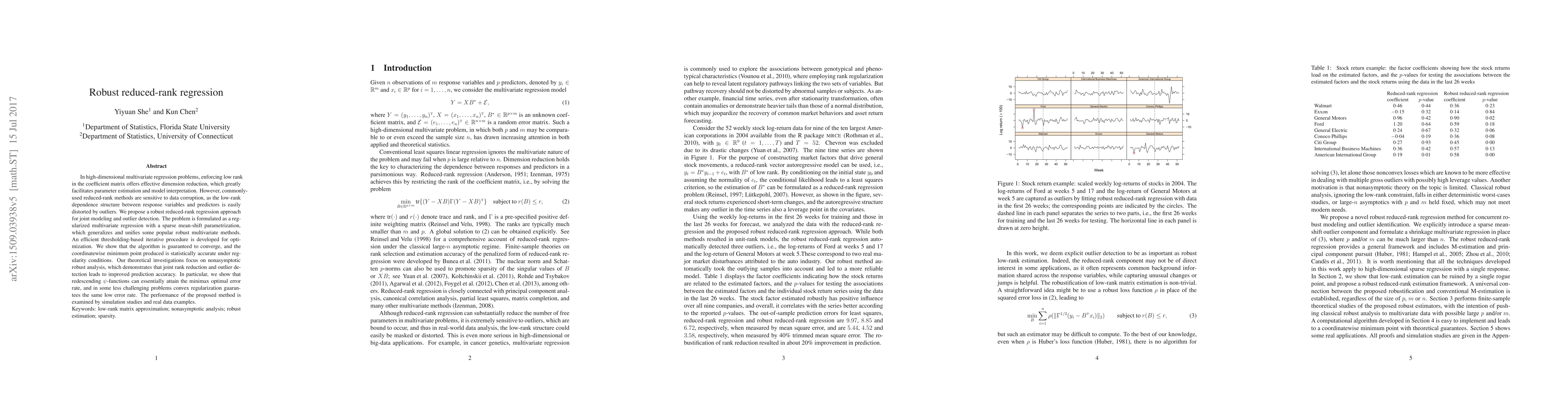 This paper proposes a robust reduced-rank regression method for high-dimensional multivariate regression, addressing sensitivity to outliers through a regularized sparse mean-shift parametrization. The method combines rank reduction and outlier detection, achieving improved prediction accuracy and optimal error rates, as demonstrated through simulations and real data examples.