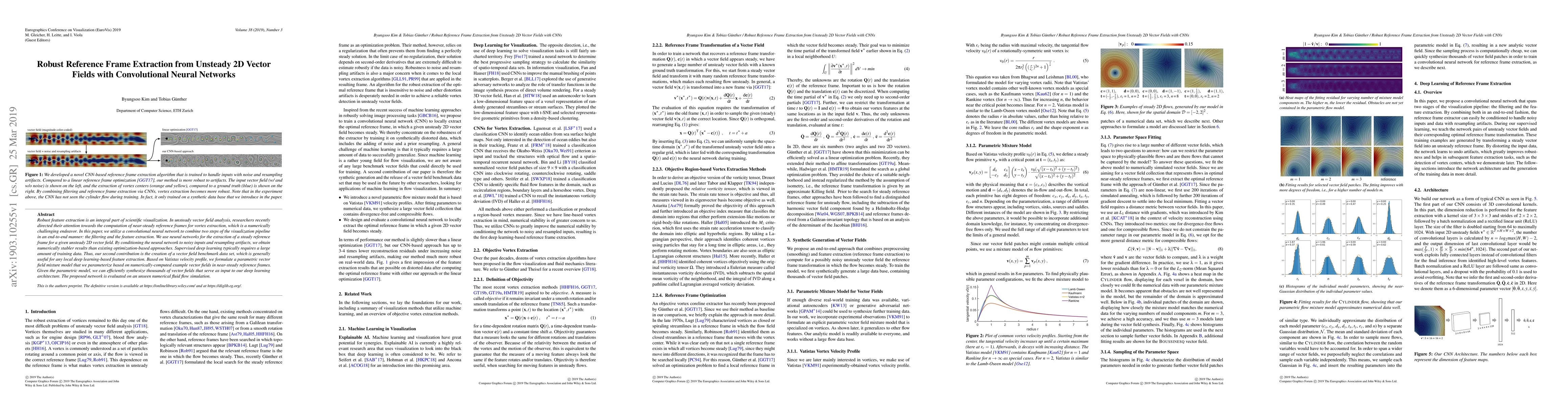 Robust feature extraction is an integral part of scientific visualization. In unsteady vector field analysis, researchers recently directed their attention towards the computation of near-steady reference frames for vortex extraction, which is a numerically challenging endeavor. In this paper, we utilize a convolutional neural network to combine two steps of the visualization pipeline in an end-to-end manner: the filtering and the feature extraction. We use neural networks for the extraction of a steady reference frame for a given unsteady 2D vector field. By conditioning the neural network to noisy inputs and resampling artifacts, we obtain numerically stabler results than existing optimization-based approaches. Supervised deep learning typically requires a large amount of training data. Thus, our second contribution is the creation of a vector field benchmark data set, which is generally useful for any local deep learning-based feature extraction. Based on Vatistas velocity profile, we formulate a parametric vector field mixture model that we parameterize based on numerically-computed example vector fields in near-steady reference frames. Given the parametric model, we can efficiently synthesize thousands of vector fields that serve as input to our deep learning architecture. The proposed network is evaluated on an unseen numerical fluid flow simulation.