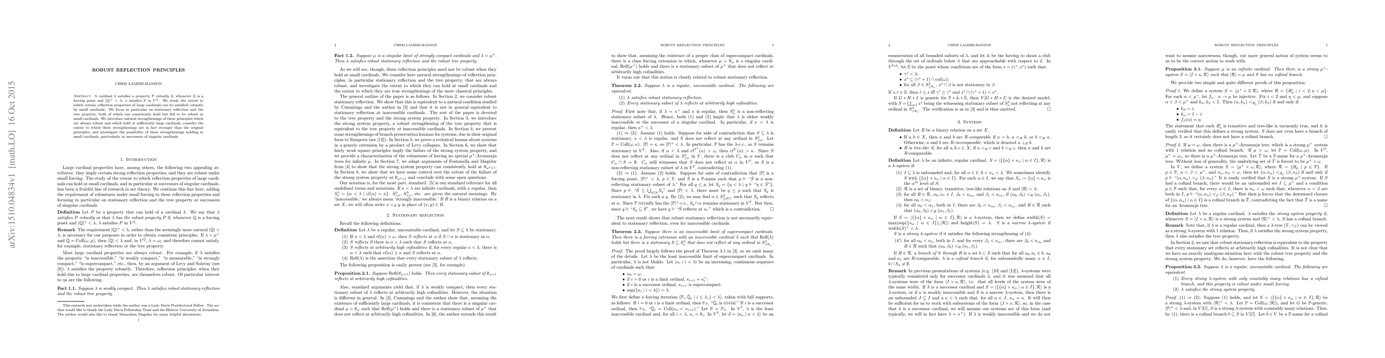 This paper explores robust reflection principles, where a cardinal satisfies a property robustly if it retains the property in all forcing extensions by posets smaller than itself. It investigates the extent to which stationary reflection and the tree property, which can consistently hold but fail robustly at small cardinals, can be strengthened to always be robust and holds at large cardinals, and examines if these strengthened principles can occur at successors of singular cardinals.