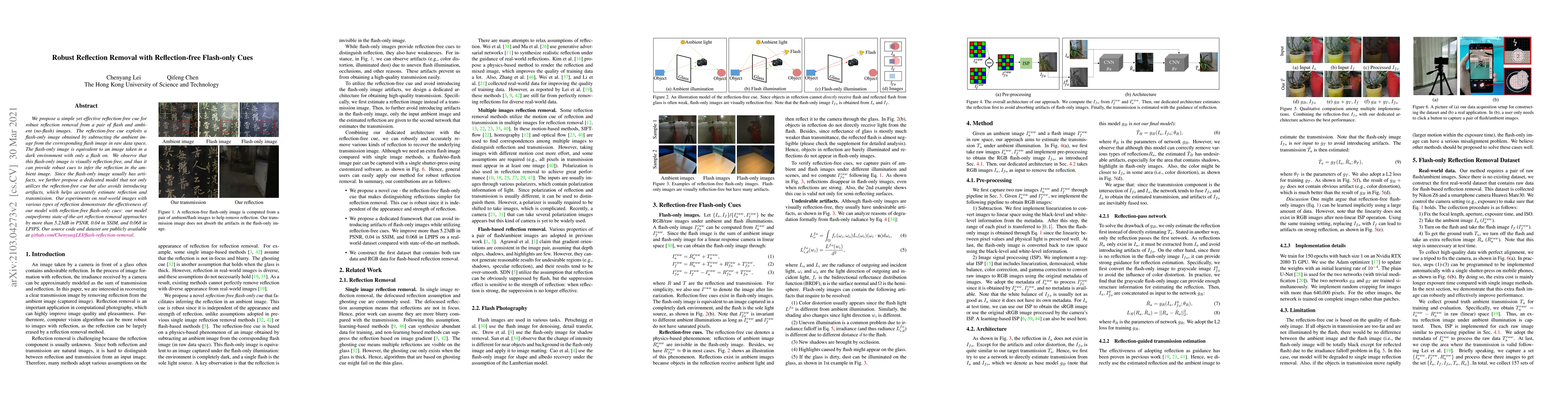 This paper proposes a method to remove reflections from images using a reflection-free cue derived from flash-only images, which are created by subtracting ambient images from flash images. The method outperforms existing techniques in reflection removal, achieving better PSNR, SSIM, and LPIPS scores.