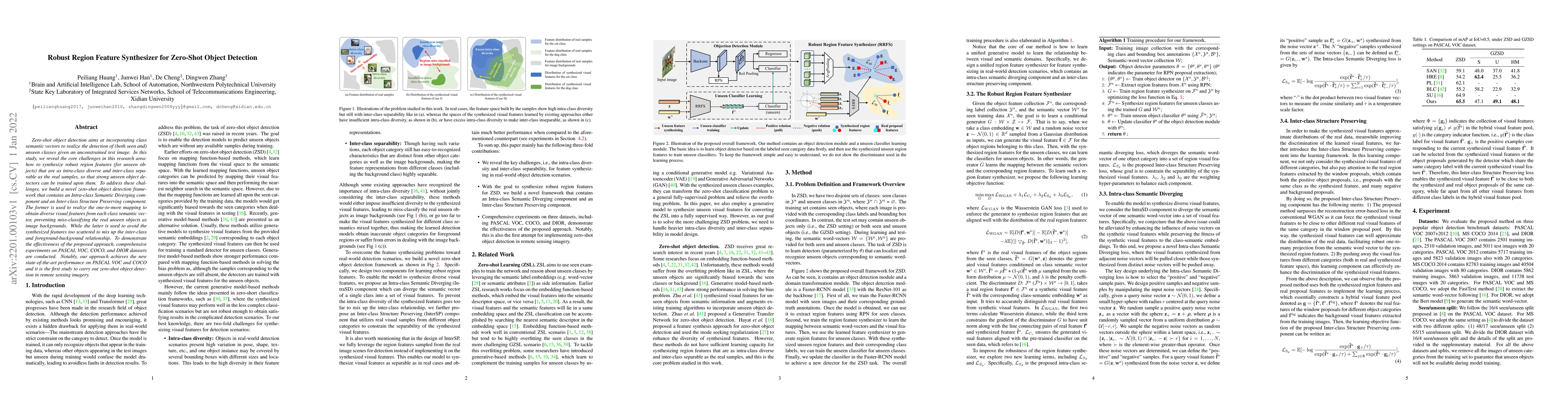 This paper proposes a novel zero-shot object detection framework with an Intra-class Semantic Diverging component and an Inter-class Structure Preserving component to synthesize robust region features for unseen classes, achieving state-of-the-art performance on PASCAL VOC, COCO, and DIOR datasets.