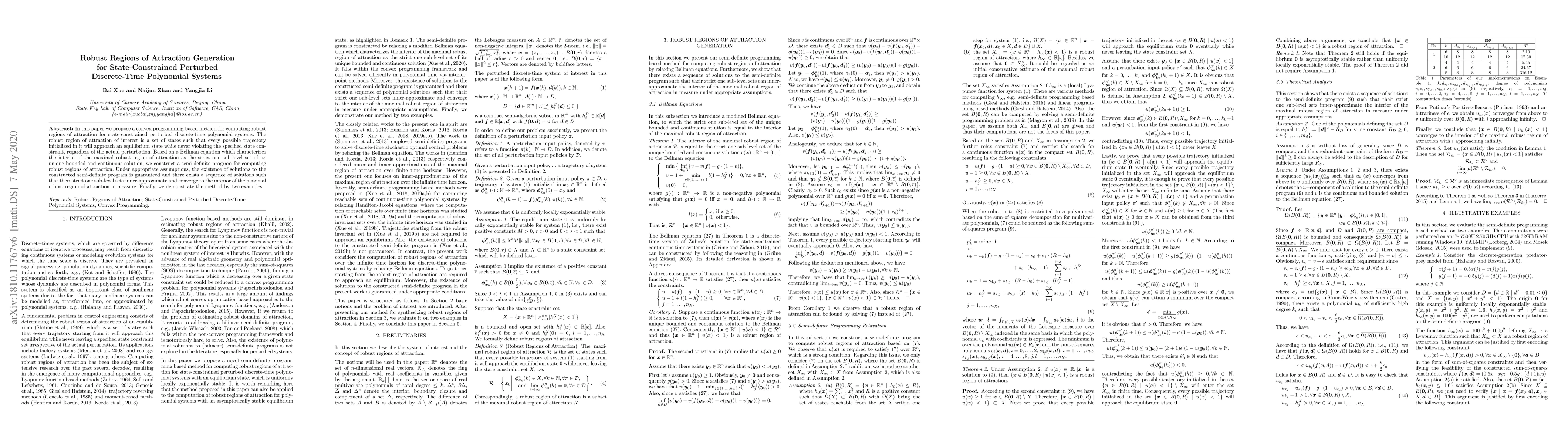 This paper introduces a convex programming approach for determining robust regions of attraction for state-constrained, perturbed discrete-time polynomial systems. It constructs a semi-definite program based on a Bellman equation to ensure trajectories approach equilibrium without violating state constraints, and demonstrates the method with two examples.
