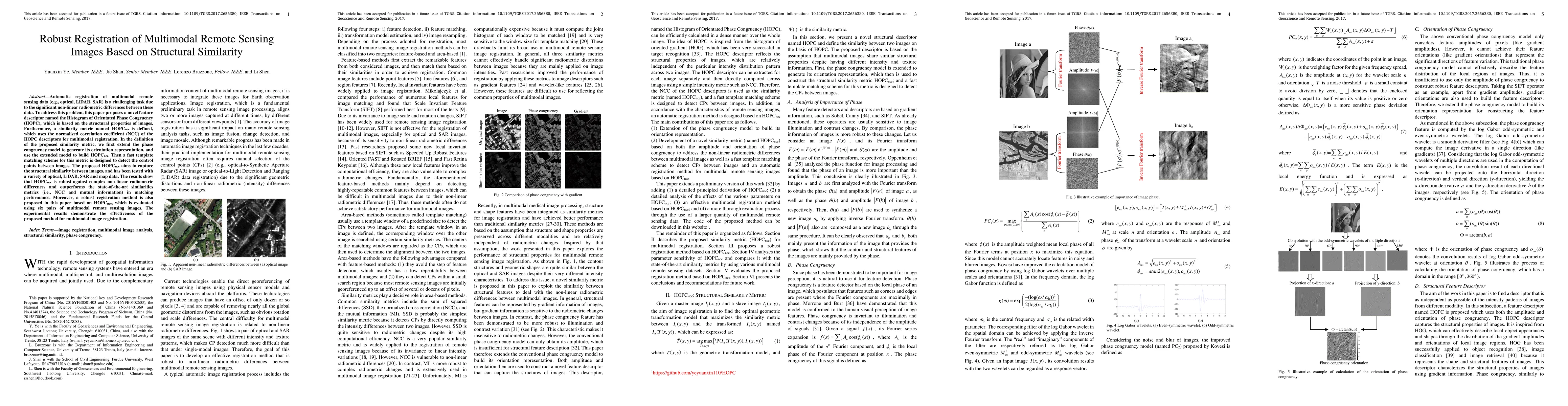 This paper proposes a novel Histogram of Orientated Phase Congruency (HOPC) descriptor and a similarity metric named HOPCncc for robust registration of multimodal remote sensing images. The HOPCncc metric outperforms existing methods in capturing structural similarity despite complex radiometric differences.