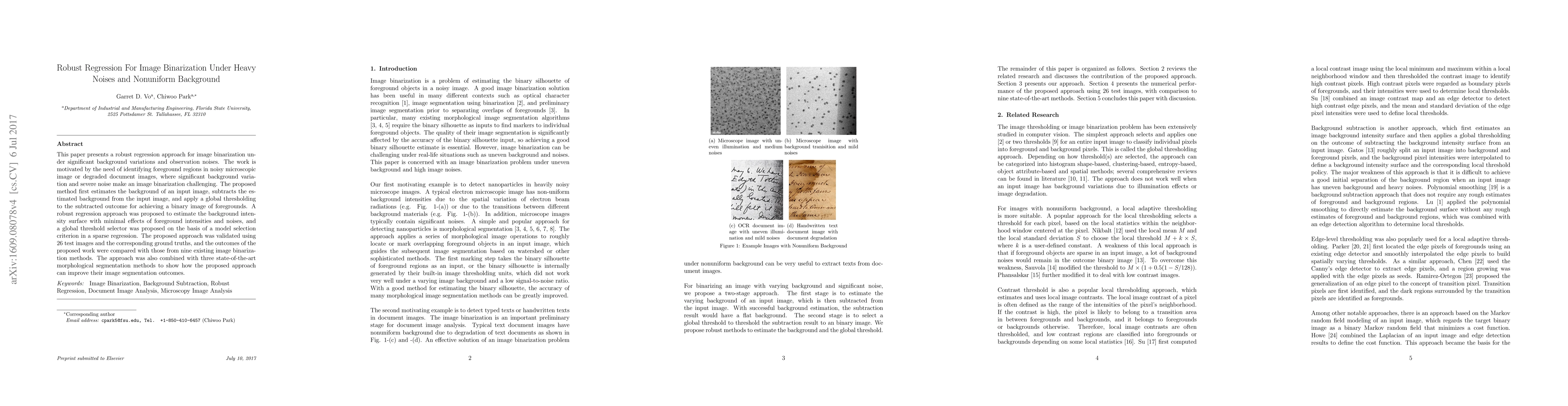 This paper proposes a robust regression method for image binarization under heavy noise and nonuniform background, achieving better foreground identification in noisy microscopic or degraded document images. The method estimates and subtracts the background, applies global thresholding, and was validated against nine existing methods and combined with three advanced segmentation techniques.