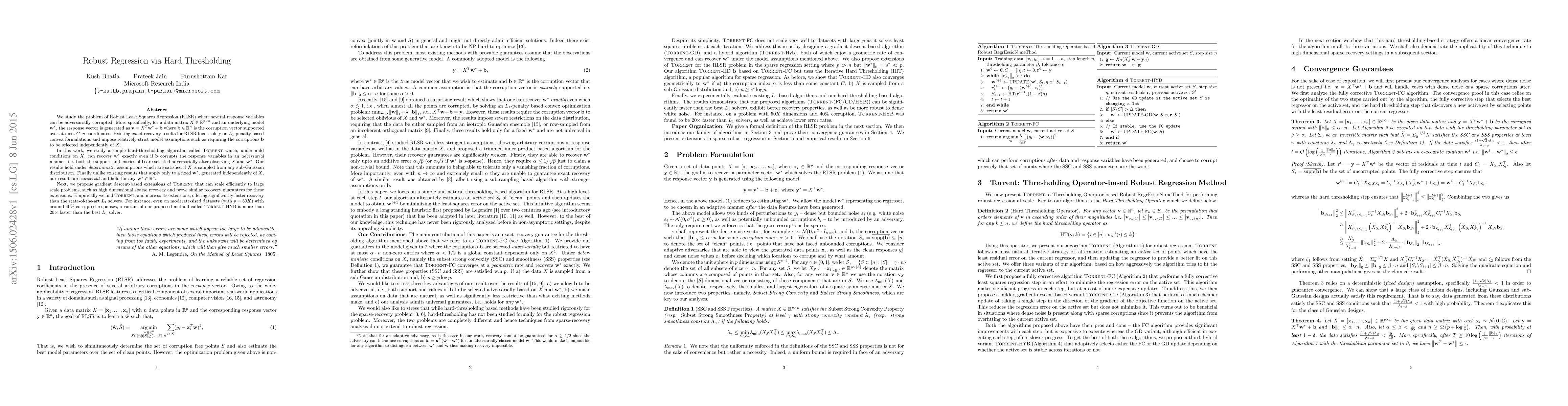 This paper proposes a hard-thresholding algorithm called TORRENT for Robust Least Squares Regression, which can recover the true model parameters even with adversarially corrupted response variables. Unlike existing methods, TORRENT's results are universal and hold for any model parameter vector, under mild conditions on the data matrix. The paper also presents scalable gradient descent extensions of TORRENT, demonstrating significant speed improvements over state-of-the-art L1 solvers in empirical evaluations.