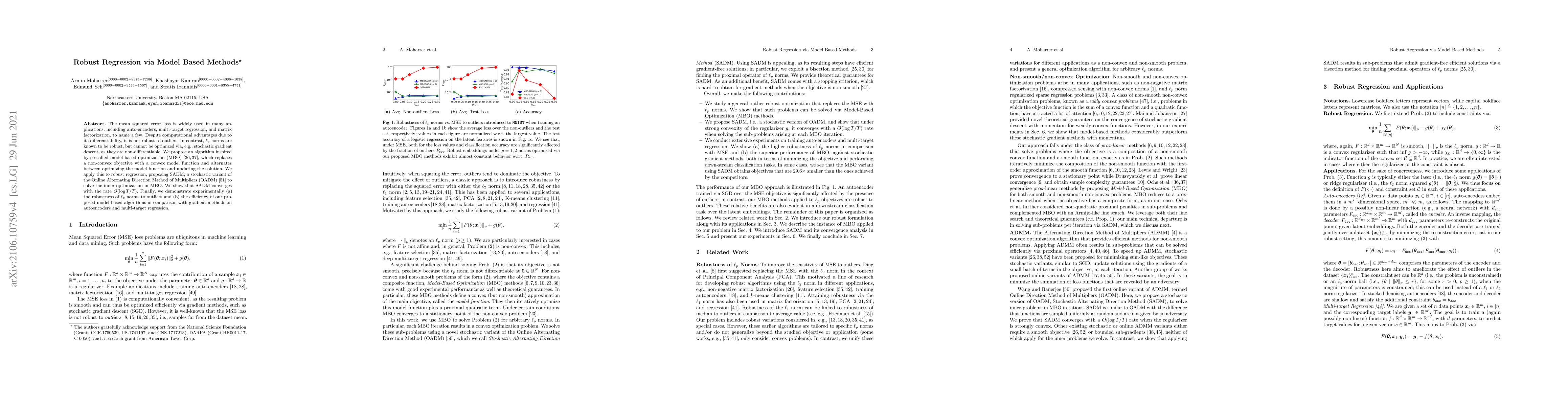 This paper proposes a robust regression method using model-based optimization (MBO) to address the mean squared error's sensitivity to outliers. The authors introduce SADM, a stochastic variant of OADM, which converges at a rate of O(log T/T), demonstrating both the robustness of l_p norms and the efficiency of the proposed method over gradient-based methods in experiments on autoencoders and multi-target regression.