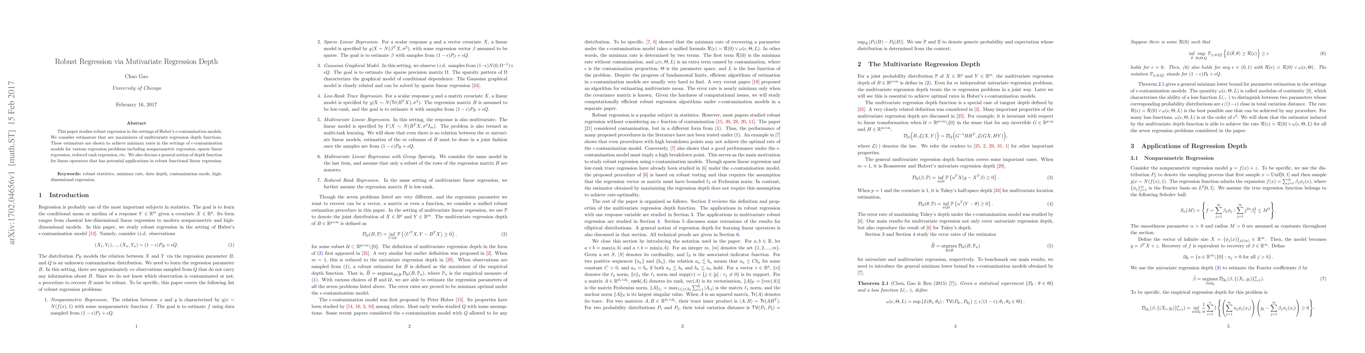 This paper proposes robust regression estimators based on multivariate regression depth, achieving minimax rates in $\epsilon$-contamination models for various regression problems. It also introduces a general depth function for linear operators with potential applications in robust functional linear regression.