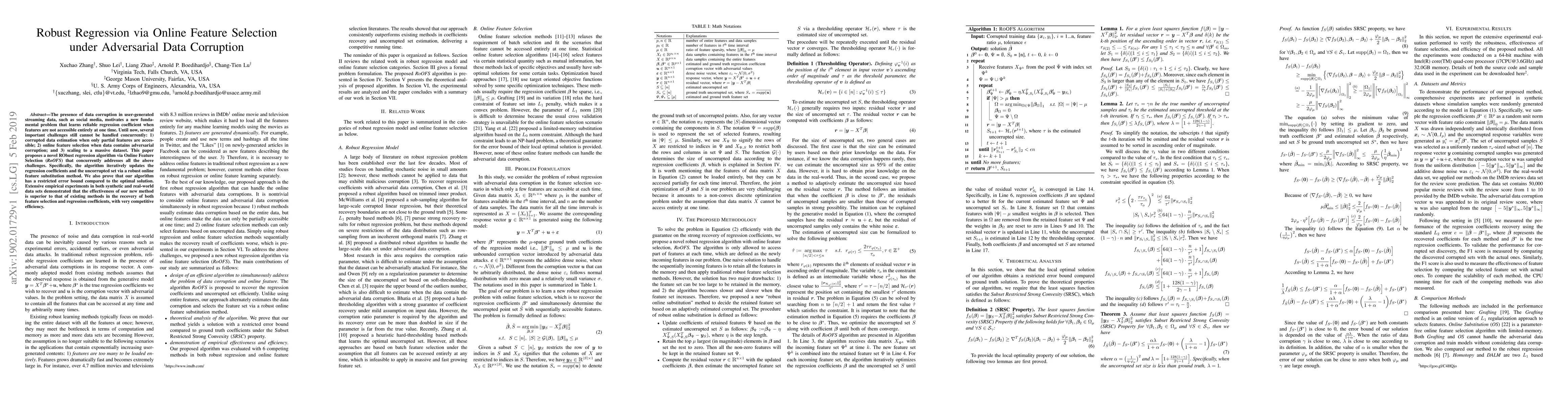 This paper introduces the RoOFS algorithm for robust regression under adversarial data corruption, addressing challenges of corrupted data estimation, online feature selection, and scalability. The algorithm iteratively updates regression coefficients and selects uncorrupted features, demonstrating superior performance and efficiency in empirical tests.