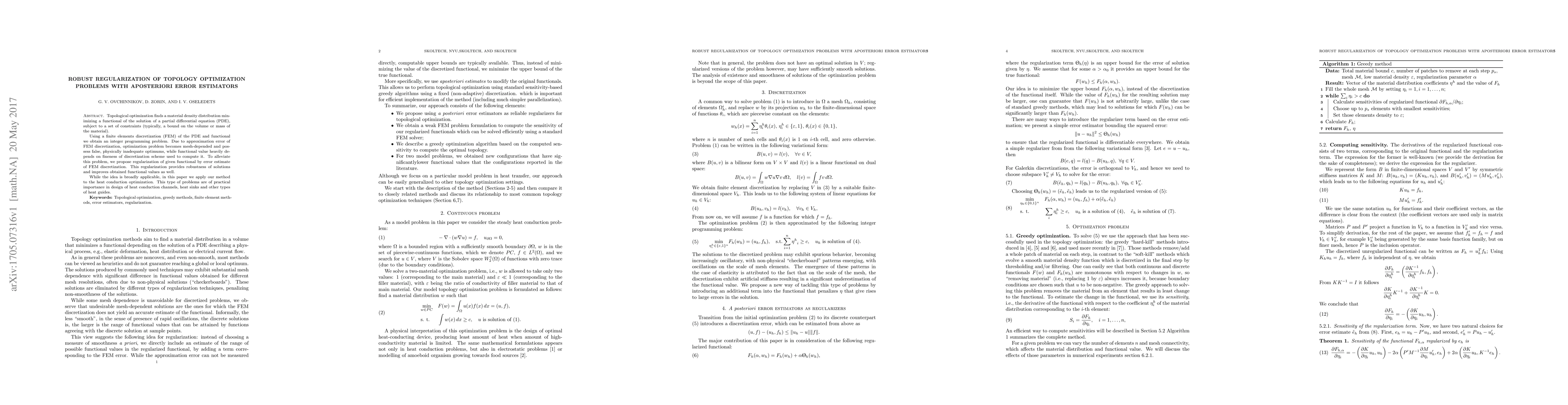 Topological optimization finds a material density distribution minimizing a functional of the solution of a partial differential equation (PDE), subject to a set of constraints (typically, a bound on the volume or mass of the material). Using a finite elements discretization (FEM) of the PDE and functional we obtain an integer programming problem. Due to approximation error of FEM discretization, optimization problem becomes mesh-depended and possess false, physically inadequate optimums, while functional value heavily depends on fineness of discretization scheme used to compute it. To alleviate this problem, we propose regularization of given functional by error estimate of FEM discretization. This regularization provides robustness of solutions and improves obtained functional values as well. While the idea is broadly applicable, in this paper we apply our method to the heat conduction optimization. This type of problems are of practical importance in design of heat conduction channels, heat sinks and other types of heat guides.