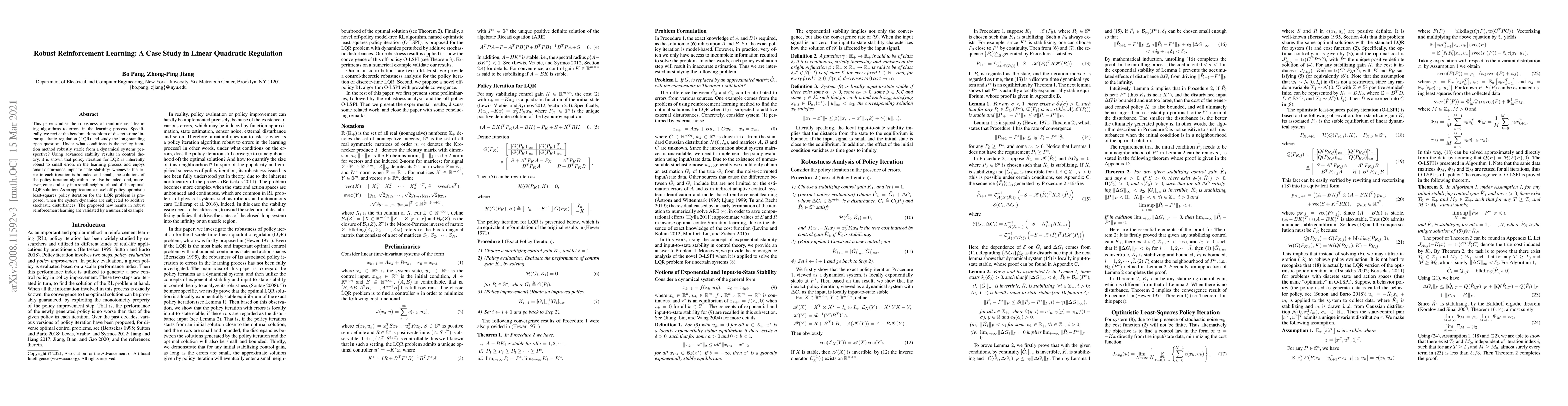 This paper investigates the robustness of reinforcement learning algorithms, particularly policy iteration for linear quadratic regulation (LQR), demonstrating its stability under small learning errors. A novel off-policy optimistic least-squares policy iteration method is introduced for LQR under stochastic disturbances, validated through numerical examples.