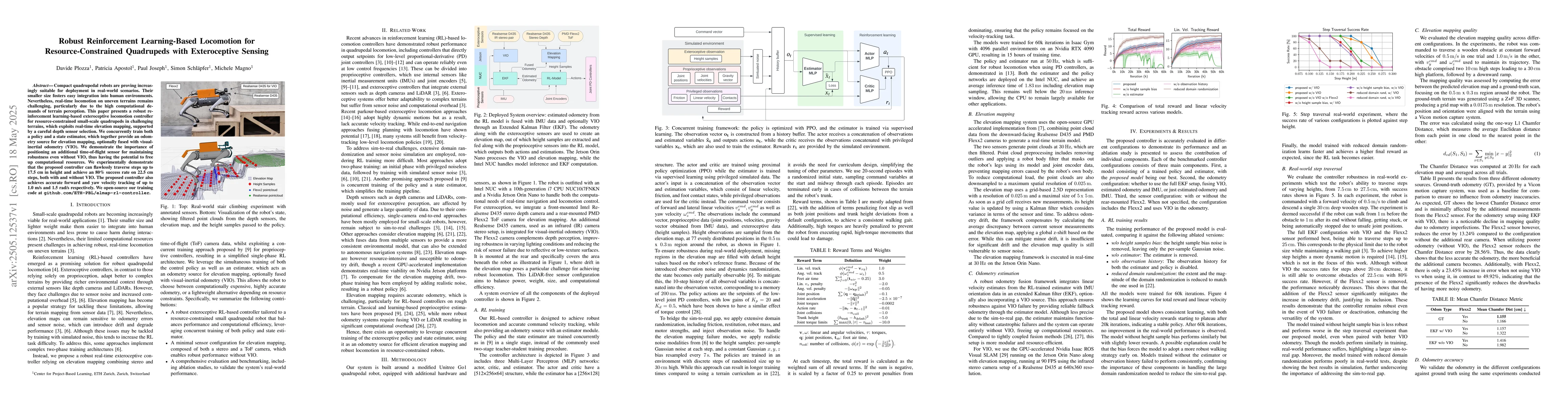 The research employs a reinforcement learning-based exteroceptive locomotion controller for resource-constrained small-scale quadruped robots, utilizing real-time elevation mapping with depth sensor selection and an optional fusion with visual-inertial odometry (VIO).