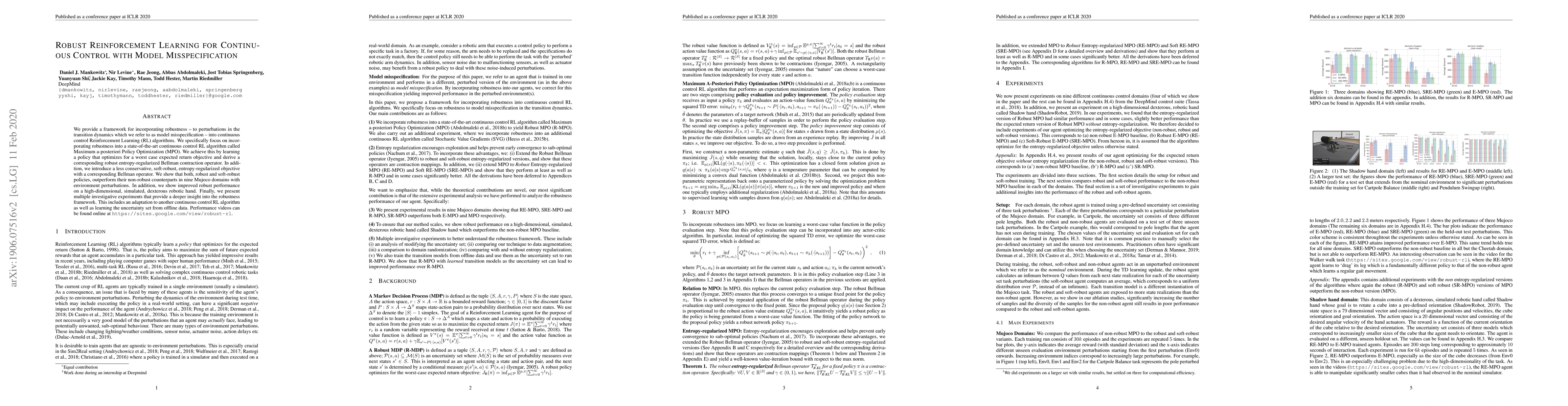 This paper develops a robust framework for continuous control Reinforcement Learning (RL) that addresses model misspecification through worst-case expected return optimization. It enhances Maximum a-posteriori Policy Optimization (MPO) and demonstrates superior performance in various Mujoco domains and a high-dimensional robotic hand simulation.