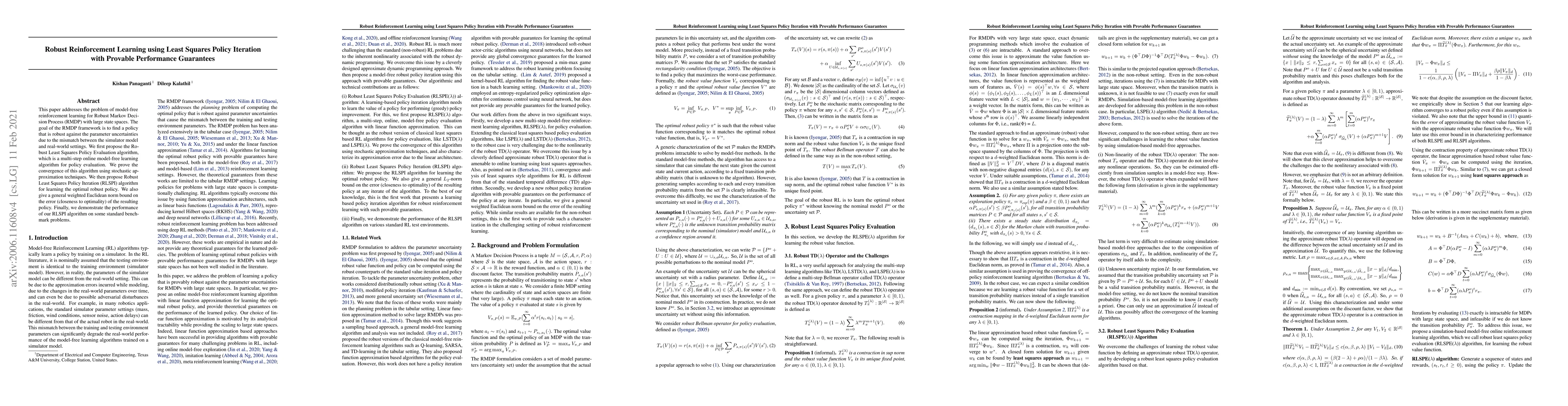 This paper proposes Robust Least Squares Policy Evaluation and Robust Least Squares Policy Iteration algorithms for model-free reinforcement learning in Robust Markov Decision Processes, providing convergence guarantees and performance bounds, and demonstrating effectiveness on benchmark problems.