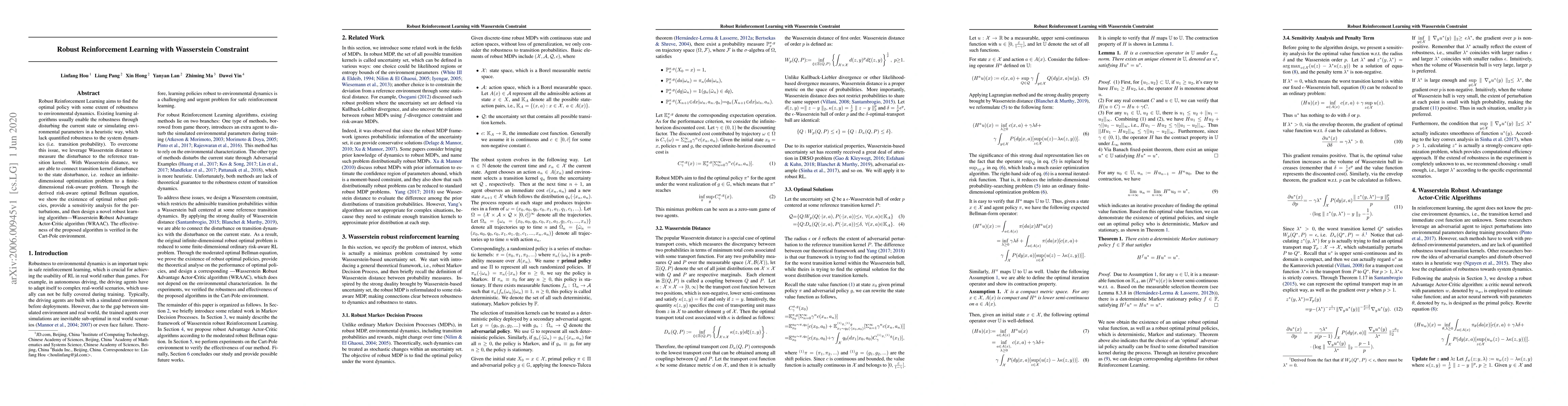 This paper proposes a novel reinforcement learning algorithm, Wasserstein Robust Advantage Actor-Critic (WRAAC), that leverages Wasserstein distance to quantify robustness against environmental dynamics. It transforms the infinite-dimensional optimization problem into a finite-dimensional risk-aware problem, demonstrating the existence of optimal robust policies and verifying the algorithm's effectiveness in the Cart-Pole environment.