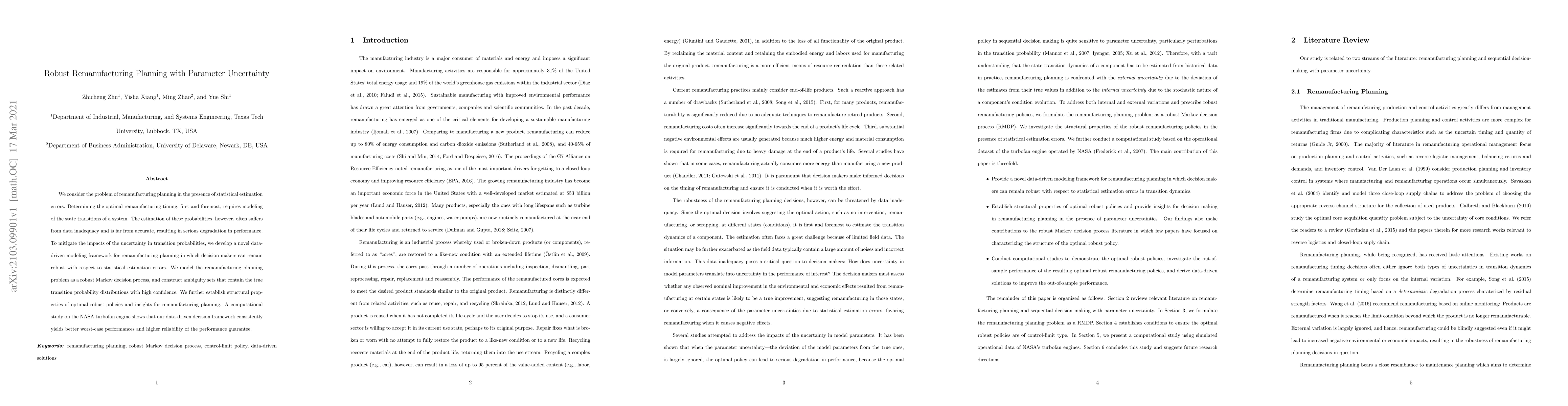 This paper develops a robust data-driven modeling framework for remanufacturing planning under statistical estimation errors, framing it as a robust Markov decision process. The proposed approach constructs ambiguity sets to account for uncertainty in transition probabilities, leading to better worst-case performance and higher reliability, as demonstrated through a computational study on NASA turbofan engines.