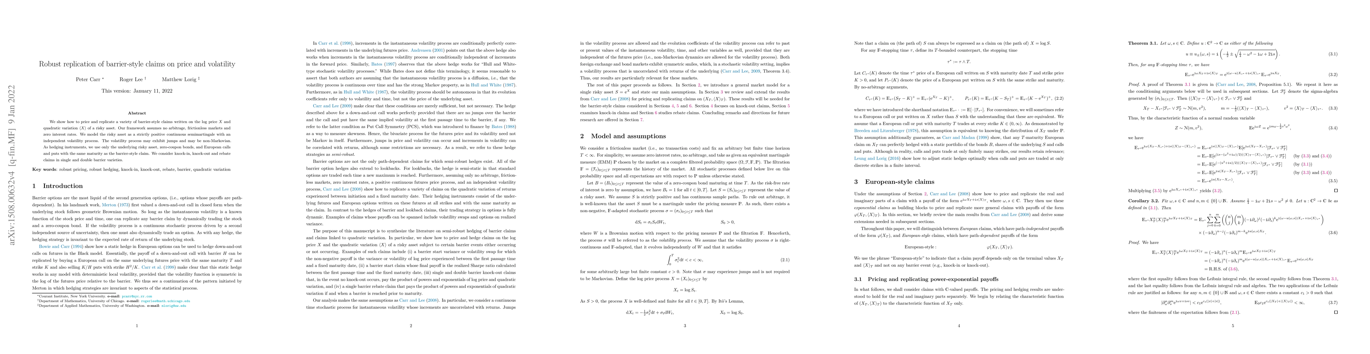 The paper presents a framework for pricing and replicating barrier-style claims on the log price and quadratic variation of a risky asset, assuming no arbitrage, frictionless markets, and zero interest rates. The risky asset is modeled as a strictly positive continuous semimartingale with an independent volatility process that can exhibit jumps and be non-Markovian.
