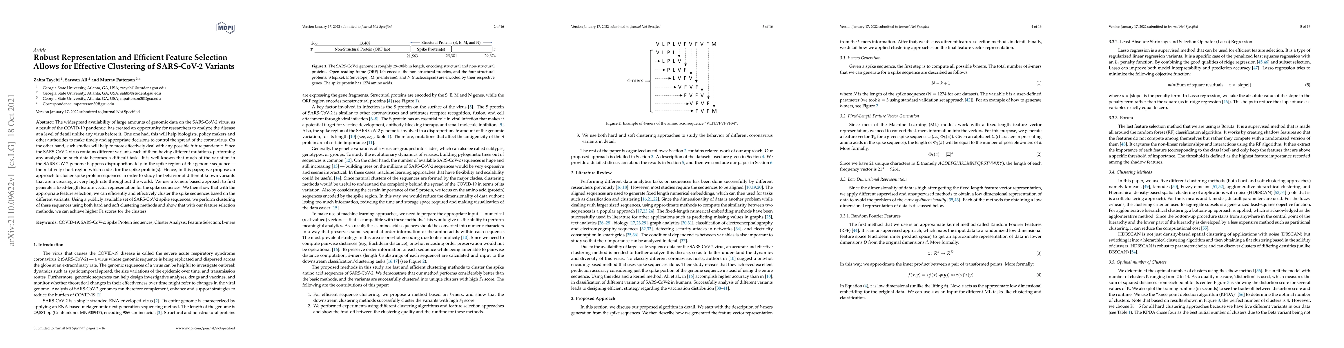 This paper proposes a k-mers based approach to generate robust feature vectors from SARS-CoV-2 spike protein sequences, followed by efficient feature selection for effective clustering of viral variants. The study demonstrates higher clustering accuracy using both hard and soft clustering methods, achieving better F1 scores compared to traditional methods.
