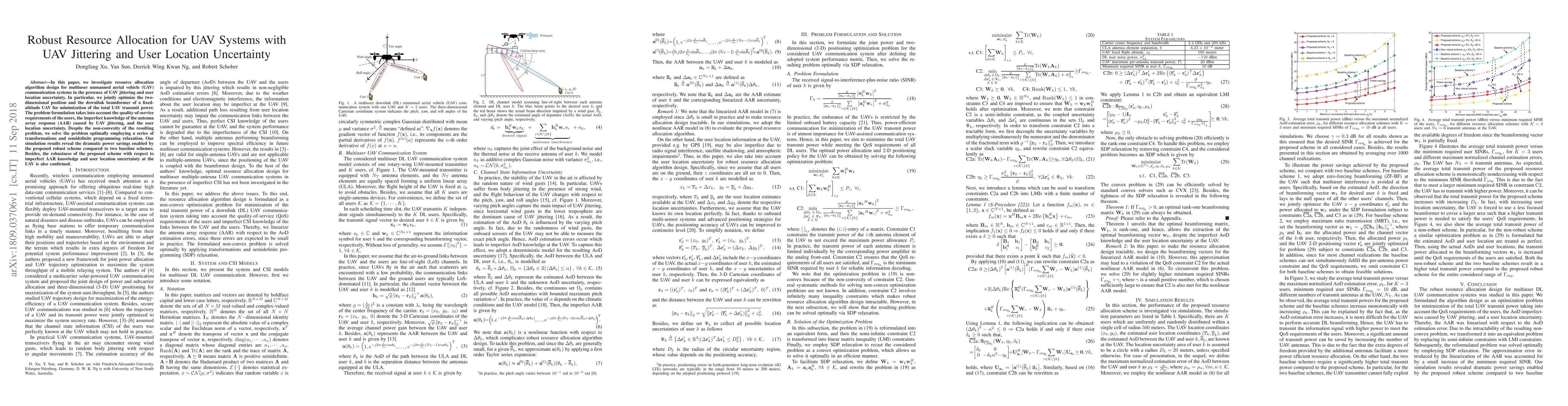 A new resource allocation algorithm for UAV communication systems minimizes total transmit power under uncertainty from user location and UAV jittering, achieving significant power savings over baseline schemes.