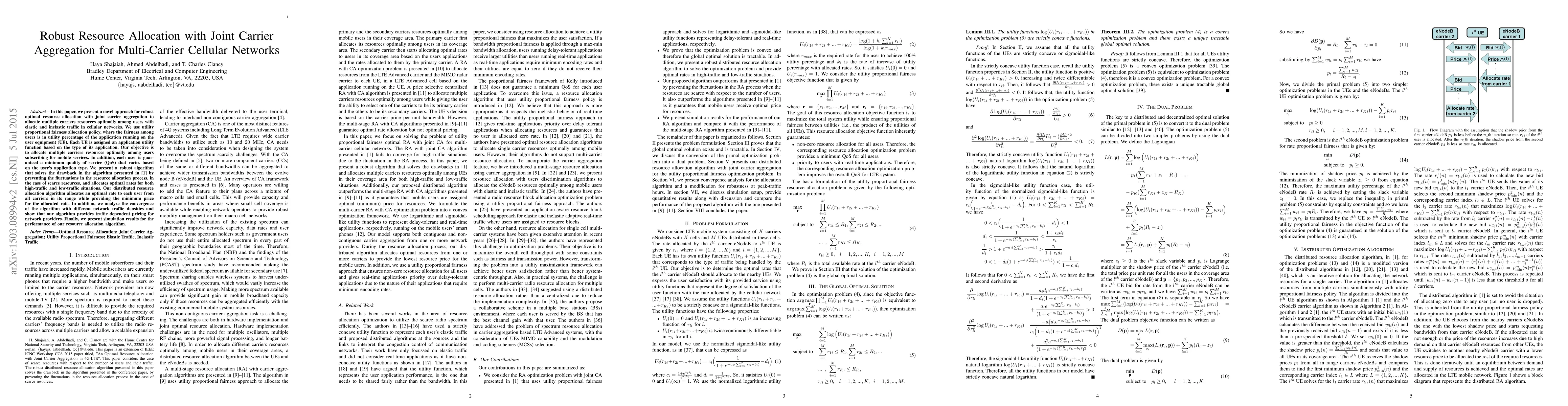 In this paper, we present a novel approach for robust optimal resource allocation with joint carrier aggregation to allocate multiple carriers resources optimally among users with elastic and inelastic traffic in cellular networks. We use utility proportional fairness allocation policy, where the fairness among users is in utility percentage of the application running on the user equipment (UE). Each UE is assigned an application utility function based on the type of its application. Our objective is to allocate multiple carriers resources optimally among users subscribing for mobile services. In addition, each user is guaranteed a minimum quality of service (QoS) that varies based on the user's application type. We present a robust algorithm that solves the drawback in the algorithm presented in [1] by preventing the fluctuations in the resource allocation process, in the case of scarce resources, and allocates optimal rates for both high-traffic and low-traffic situations. Our distributed resource allocation algorithm allocates an optimal rate to each user from all carriers in its range while providing the minimum price for the allocated rate. In addition, we analyze the convergence of the algorithm with different network traffic densities and show that our algorithm provides traffic dependent pricing for network providers. Finally, we present simulation results for the performance of our resource allocation algorithm.