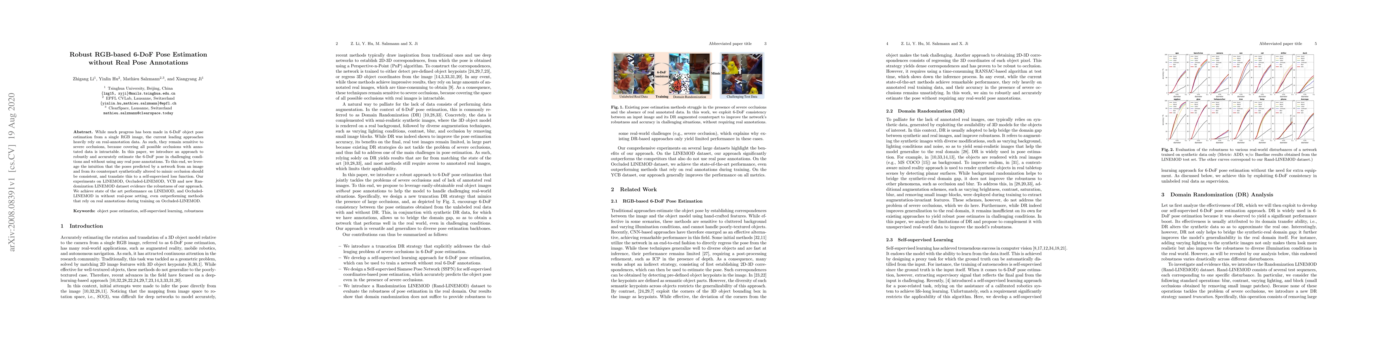 This paper presents a self-supervised method for robust 6-DoF pose estimation from single RGB images without requiring real pose annotations. It leverages synthetic occlusions to create a self-supervised loss function, achieving state-of-the-art performance on the LINEMOD and Occluded-LINEMOD datasets.