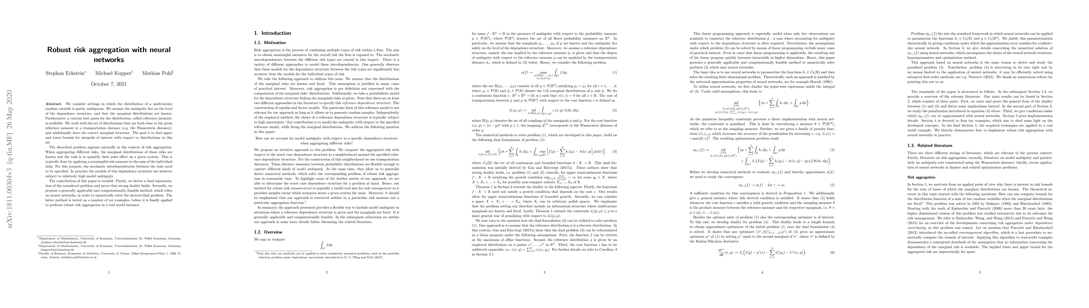 We consider settings in which the distribution of a multivariate random variable is partly ambiguous. We assume the ambiguity lies on the level of the dependence structure, and that the marginal distributions are known. Furthermore, a current best guess for the distribution, called reference measure, is available. We work with the set of distributions that are both close to the given reference measure in a transportation distance (e.g. the Wasserstein distance), and additionally have the correct marginal structure. The goal is to find upper and lower bounds for integrals of interest with respect to distributions in this set. The described problem appears naturally in the context of risk aggregation. When aggregating different risks, the marginal distributions of these risks are known and the task is to quantify their joint effect on a given system. This is typically done by applying a meaningful risk measure to the sum of the individual risks. For this purpose, the stochastic interdependencies between the risks need to be specified. In practice the models of this dependence structure are however subject to relatively high model ambiguity. The contribution of this paper is twofold: Firstly, we derive a dual representation of the considered problem and prove that strong duality holds. Secondly, we propose a generally applicable and computationally feasible method, which relies on neural networks, in order to numerically solve the derived dual problem. The latter method is tested on a number of toy examples, before it is finally applied to perform robust risk aggregation in a real world instance.