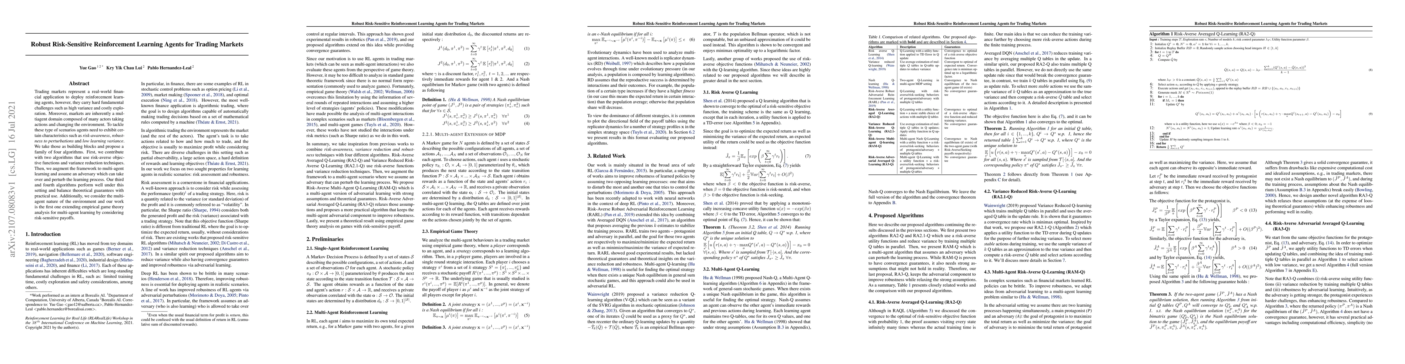 Trading markets represent a real-world financial application to deploy reinforcement learning agents, however, they carry hard fundamental challenges such as high variance and costly exploration. Moreover, markets are inherently a multiagent domain composed of many actors taking actions and changing the environment. To tackle these type of scenarios agents need to exhibit certain characteristics such as risk-awareness, robustness to perturbations and low learning variance. We take those as building blocks and propose a family of four algorithms. First, we contribute with two algorithms that use risk-averse objective functions and variance reduction techniques. Then, we augment the framework to multi-agent learning and assume an adversary which can take over and perturb the learning process. Our third and fourth algorithms perform well under this setting and balance theoretical guarantees with practical use. Additionally, we consider the multi-agent nature of the environment and our work is the first one extending empirical game theory analysis for multi-agent learning by considering risk-sensitive payoffs.