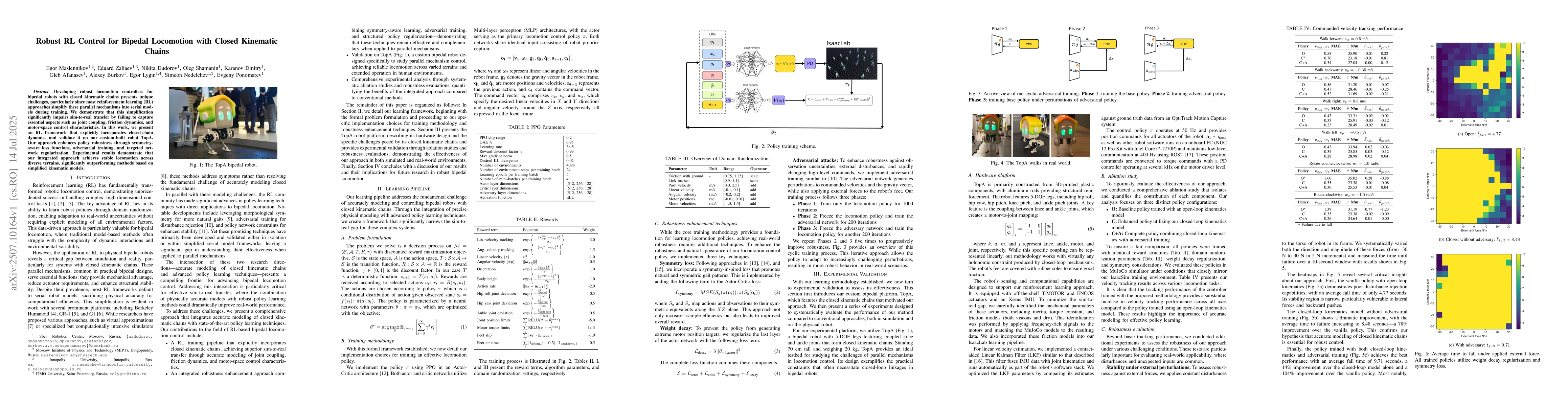 Developing robust locomotion controllers for bipedal robots with closed kinematic chains presents unique challenges, particularly since most reinforcement learning (RL) approaches simplify these parallel mechanisms into serial models during training. We demonstrate that this simplification significantly impairs sim-to-real transfer by failing to capture essential aspects such as joint coupling, friction dynamics, and motor-space control characteristics. In this work, we present an RL framework that explicitly incorporates closed-chain dynamics and validate it on our custom-built robot TopA. Our approach enhances policy robustness through symmetry-aware loss functions, adversarial training, and targeted network regularization. Experimental results demonstrate that our integrated approach achieves stable locomotion across diverse terrains, significantly outperforming methods based on simplified kinematic models.