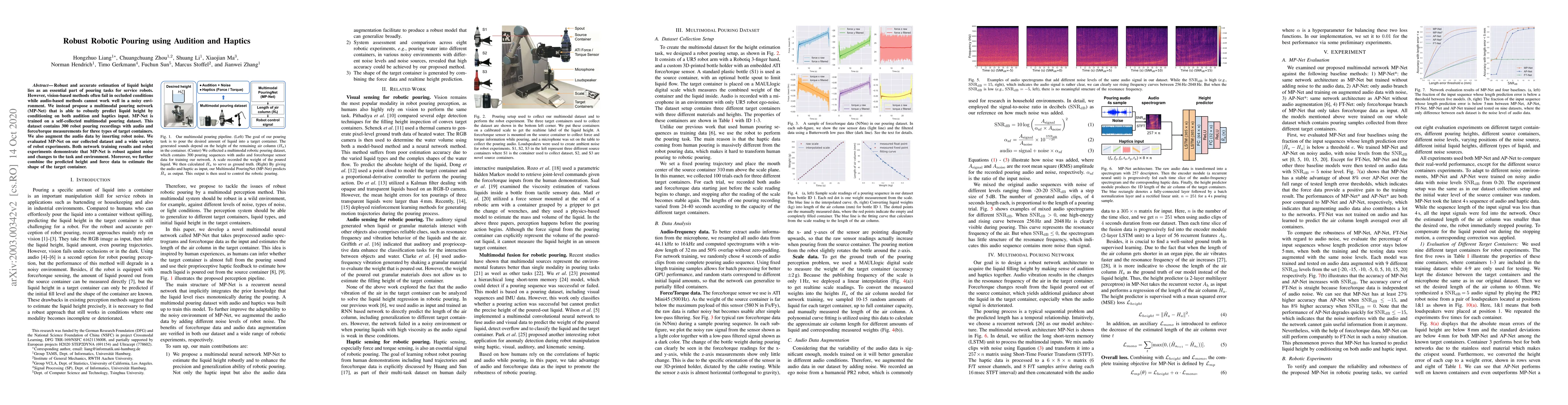Robust and accurate estimation of liquid height lies as an essential part of pouring tasks for service robots. However, vision-based methods often fail in occluded conditions while audio-based methods cannot work well in a noisy environment. We instead propose a multimodal pouring network (MP-Net) that is able to robustly predict liquid height by conditioning on both audition and haptics input. MP-Net is trained on a self-collected multimodal pouring dataset. This dataset contains 300 robot pouring recordings with audio and force/torque measurements for three types of target containers. We also augment the audio data by inserting robot noise. We evaluated MP-Net on our collected dataset and a wide variety of robot experiments. Both network training results and robot experiments demonstrate that MP-Net is robust against noise and changes to the task and environment. Moreover, we further combine the predicted height and force data to estimate the shape of the target container.