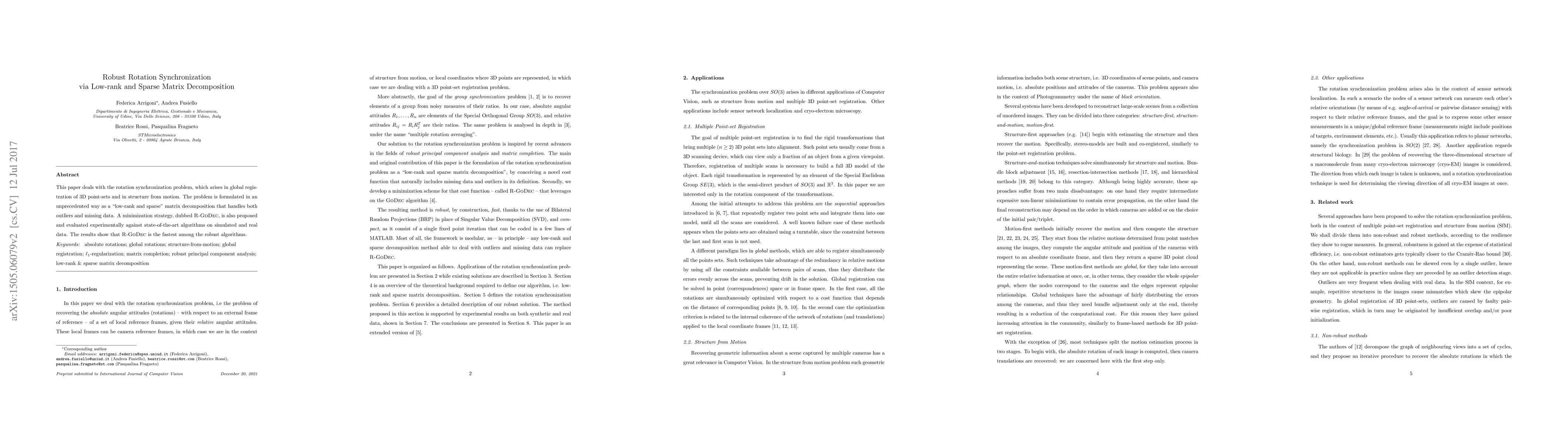 This paper introduces a novel "low-rank and sparse" matrix decomposition method, R-GoDec, for robust rotation synchronization in 3D point-set registration and structure from motion, demonstrating superior performance and speed compared to state-of-the-art algorithms.