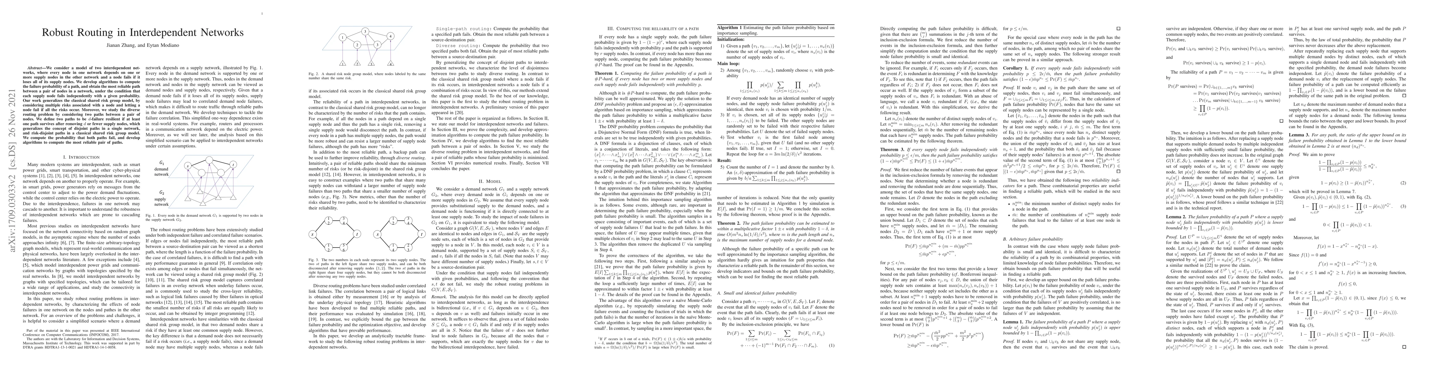 We consider a model of two interdependent networks, where every node in one network depends on one or more supply nodes in the other network and a node fails if it loses all of its supply nodes. We develop algorithms to compute the failure probability of a path, and obtain the most reliable path between a pair of nodes in a network, under the condition that each supply node fails independently with a given probability. Our work generalizes the classical shared risk group model, by considering multiple risks associated with a node and letting a node fail if all the risks occur. Moreover, we study the diverse routing problem by considering two paths between a pair of nodes. We define two paths to be $d$-failure resilient if at least one path survives after removing $d$ or fewer supply nodes, which generalizes the concept of disjoint paths in a single network, and risk-disjoint paths in a classical shared risk group model. We compute the probability that both paths fail, and develop algorithms to compute the most reliable pair of paths.
