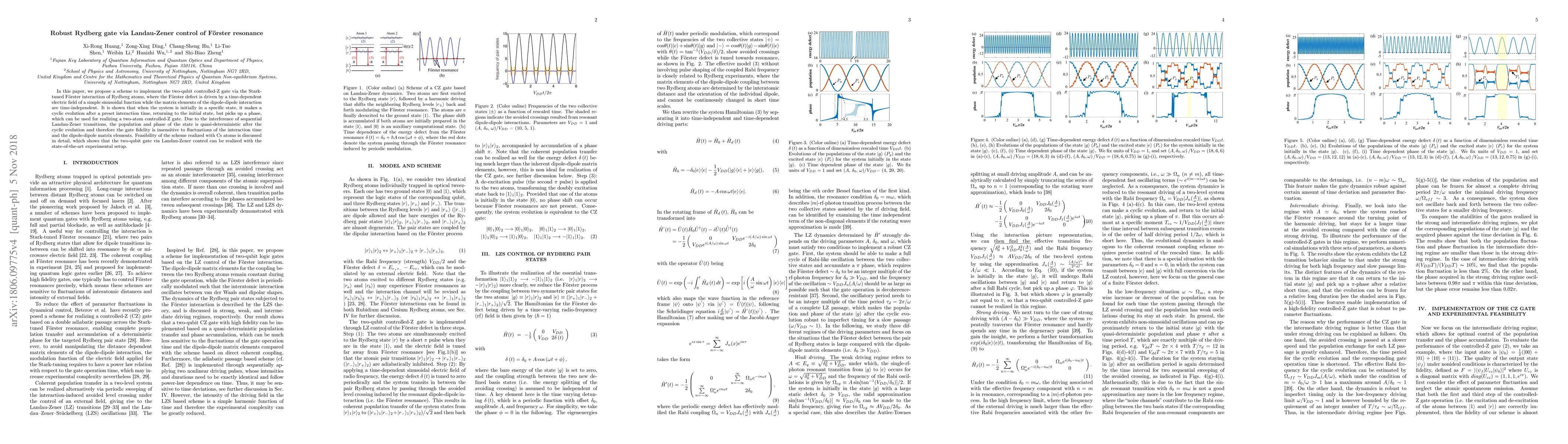 In this paper, we propose a scheme to implement the two-qubit controlled-Z gate via the Stark-tuned F\"orster interaction of Rydberg atoms, where the F\"orster defect is driven by a time-dependent electric field of a simple sinusoidal function while the matrix elements of the dipole-dipole interaction are time-independent. It is shown that when the system is initially in a specific state, it makes a cyclic evolution after a preset interaction time, returning to the initial state, but picks up a phase, which can be used for realizing a two-atom controlled-Z gate. Due to the interference of sequential Landau-Zener transitions, the population and phase of the state is quasi-deterministic after the cyclic evolution and therefore the gate fidelity is insensitive to fluctuations of the interaction time and the dipole-dipole matrix elements. Feasibility of the scheme realized with Cs atoms is discussed in detail, which shows that the two-qubit gate via Landau-Zener control can be realized with the state-of-the-art experimental setup.