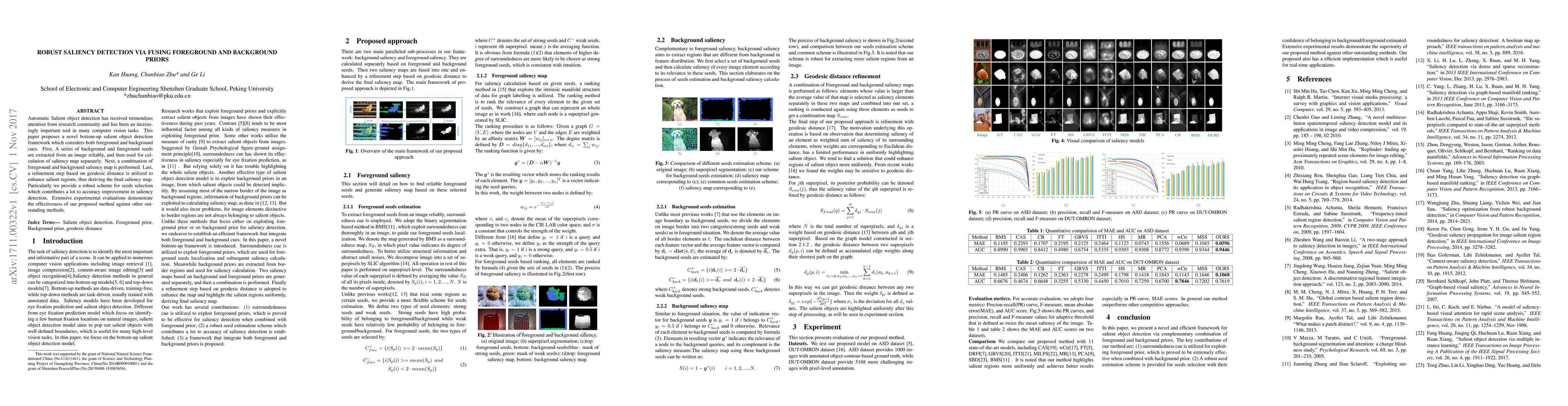 This paper proposes a novel framework for salient object detection that integrates both foreground and background priors. It selects seeds for both regions to compute separate saliency maps, combines them, and refines the final map using geodesic distance, achieving improved accuracy and effectiveness over other methods.