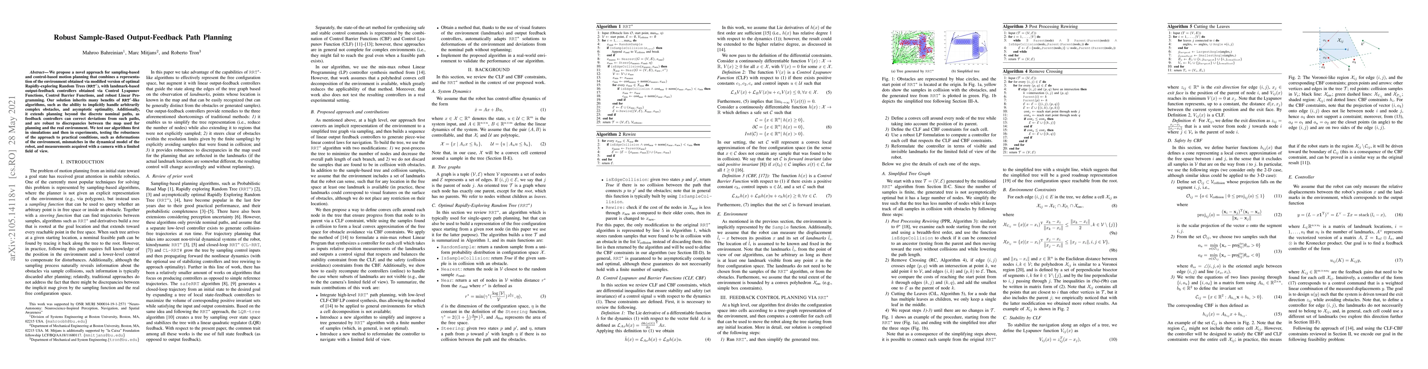 We propose a novel approach for sampling-based and control-based motion planning that combines a representation of the environment obtained via a modified version of optimal Rapidly-exploring Random Trees (RRT*), with landmark-based output-feedback controllers obtained via Control Lyapunov Functions, Control Barrier Functions, and robust Linear Programming. Our solution inherits many benefits of RRT*-like algorithms, such as the ability to implicitly handle arbitrarily complex obstacles, and asymptotic optimality. Additionally, it extends planning beyond the discrete nominal paths, as feedback controllers can correct deviations from such paths, and are robust to discrepancies between the map used for planning and the real environment. We test our algorithms first in simulations and then in experiments, testing the robustness of the approach to practical conditions, such as deformations of the environment, mismatches in the dynamical model of the robot, and measurements acquired with a camera with a limited field of view.