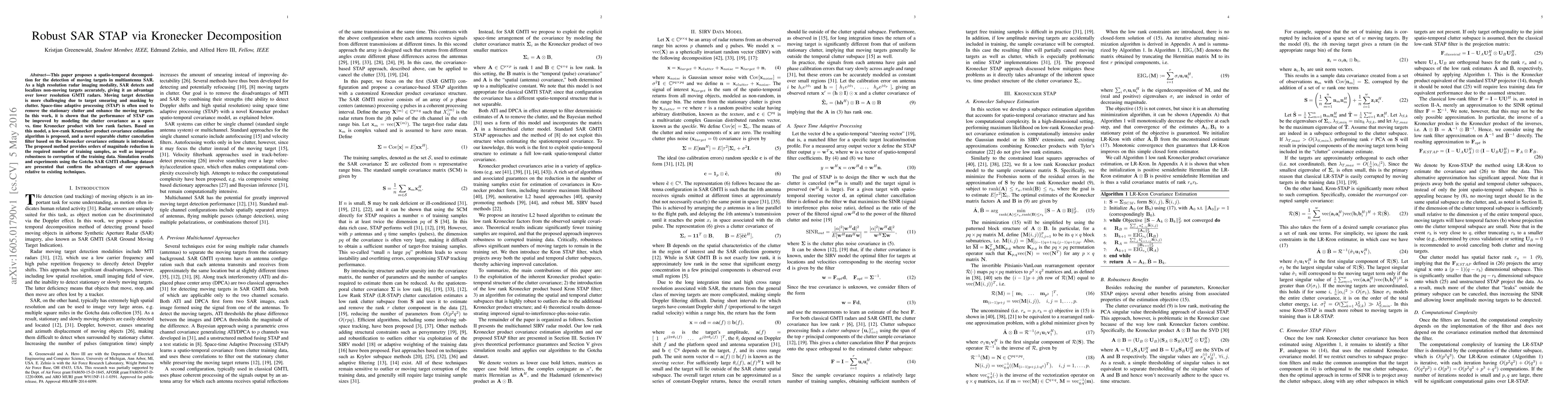 This paper introduces a robust space-time adaptive processing (STAP) method for moving target detection in multiantenna SAR using Kronecker decomposition to model the clutter covariance, significantly reducing training sample requirements and improving robustness. The proposed low-rank Kronecker product covariance estimation and separable filter show superior performance over existing techniques.
