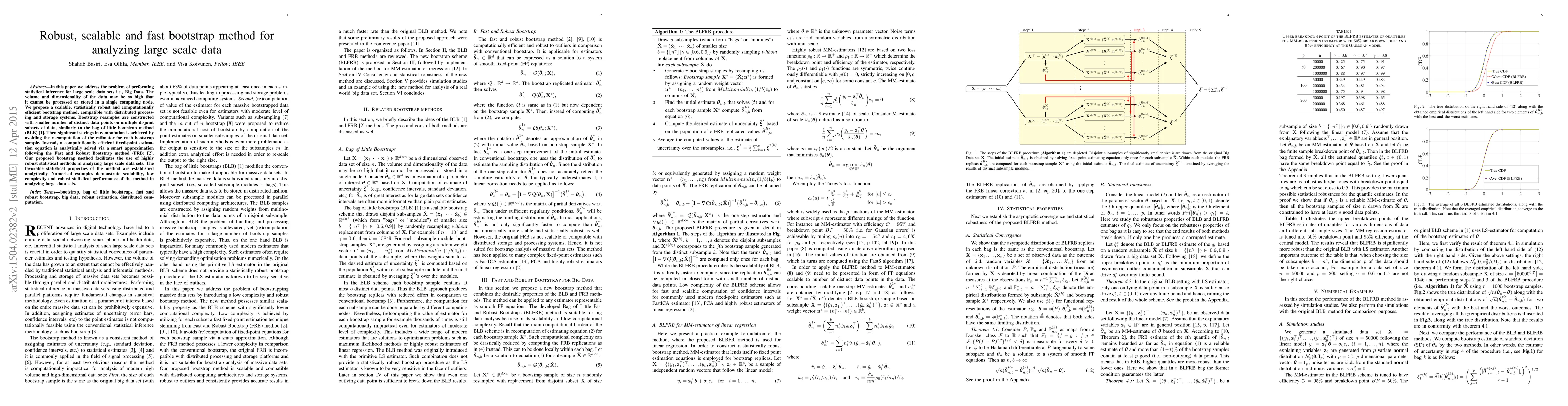 In this paper we address the problem of performing statistical inference for large scale data sets i.e., Big Data. The volume and dimensionality of the data may be so high that it cannot be processed or stored in a single computing node. We propose a scalable, statistically robust and computationally efficient bootstrap method, compatible with distributed processing and storage systems. Bootstrap resamples are constructed with smaller number of distinct data points on multiple disjoint subsets of data, similarly to the bag of little bootstrap method (BLB) [1]. Then significant savings in computation is achieved by avoiding the re-computation of the estimator for each bootstrap sample. Instead, a computationally efficient fixed-point estimation equation is analytically solved via a smart approximation following the Fast and Robust Bootstrap method (FRB) [2]. Our proposed bootstrap method facilitates the use of highly robust statistical methods in analyzing large scale data sets. The favorable statistical properties of the method are established analytically. Numerical examples demonstrate scalability, low complexity and robust statistical performance of the method in analyzing large data sets.