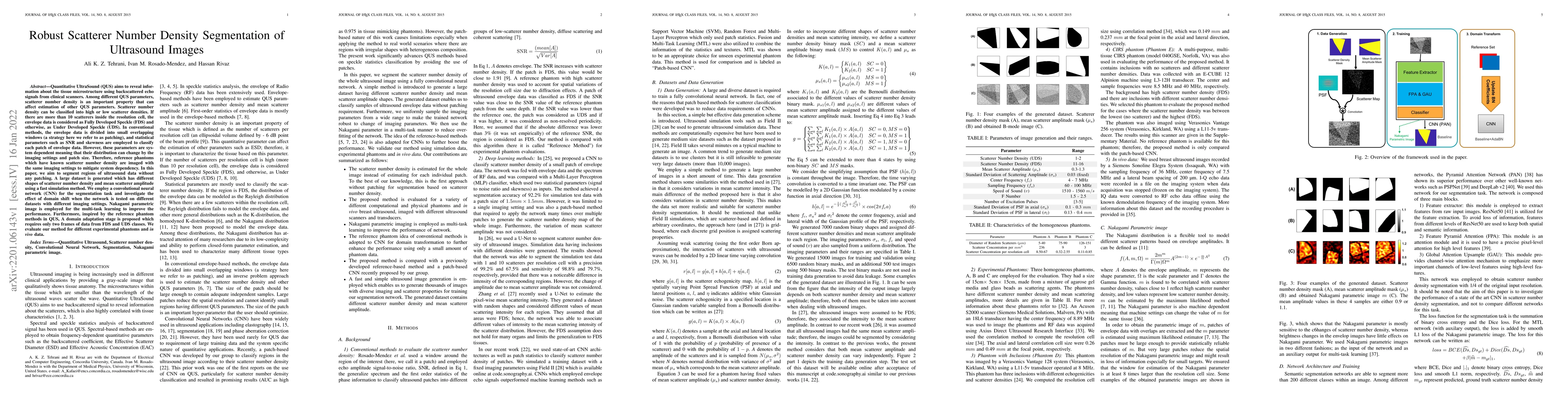 This paper proposes a convolutional neural network (CNN) to segment scatterer number density in ultrasound images without patching, employing a large simulated dataset and Nakagami parametric images for multi-task learning. A domain adaptation stage using only two frames from Fully Developed Speckle and Under Developed Speckle classes mitigates system dependency, and the method is evaluated on both phantoms and in vivo data.