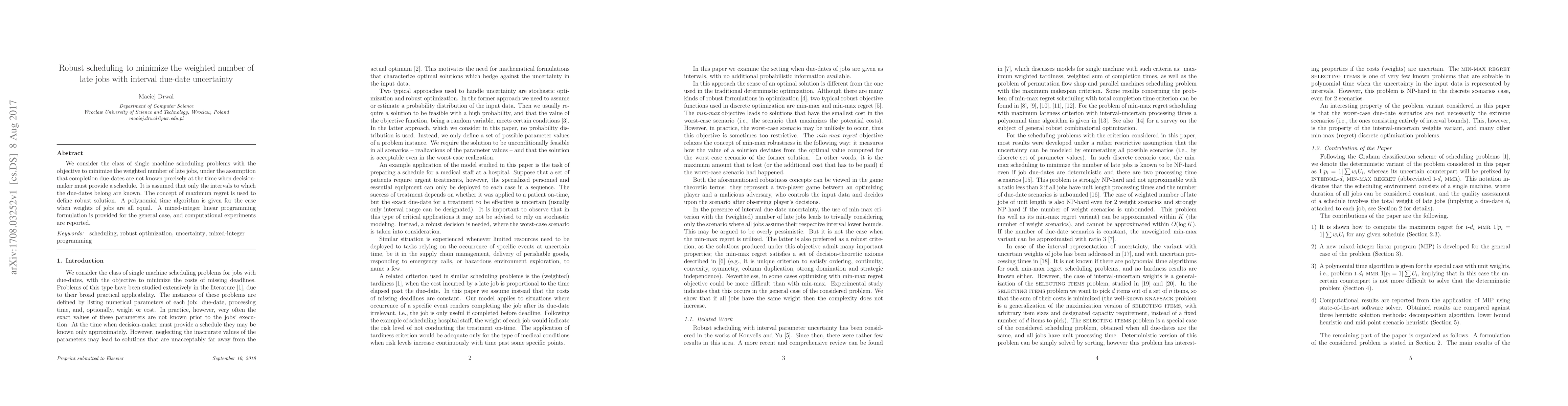We consider the class of single machine scheduling problems with the objective to minimize the weighted number of late jobs, under the assumption that completion due-dates are not known precisely at the time when decision-maker must provide a schedule. It is assumed that only the intervals to which the due-dates belong are known. The concept of maximum regret is used to define robust solution. A polynomial time algorithm is given for the case when weights of jobs are all equal. A mixed-integer linear programming formulation is provided for the general case, and computational experiments are reported.